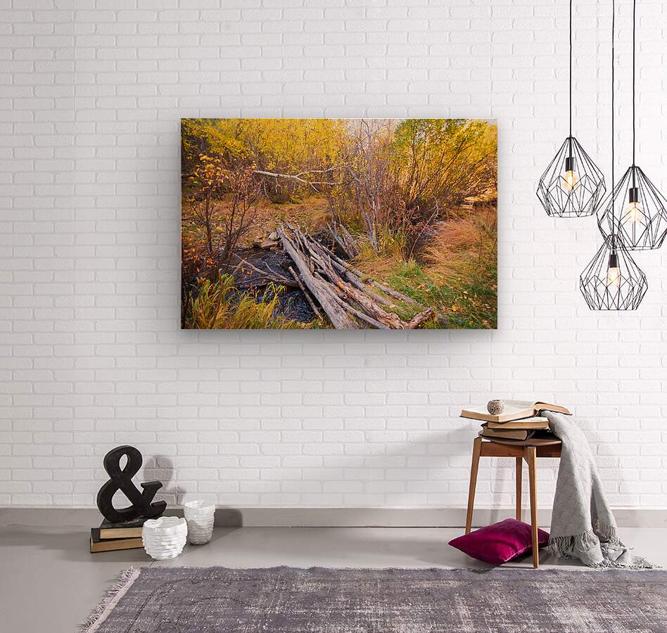 Rustic Log Bridge in Golden Autumn Forest – Serene Fall Creek  Canvas print