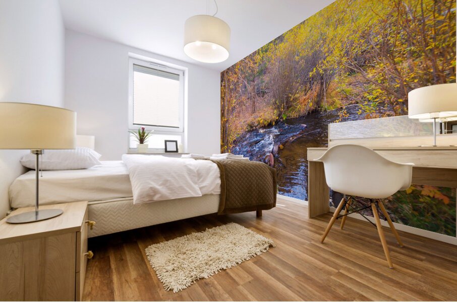 the essence of autumn with a peaceful creek gently flowing through a landscape bathed in golden fall foliage. The vibrant hues of amber gold and fiery...[+]