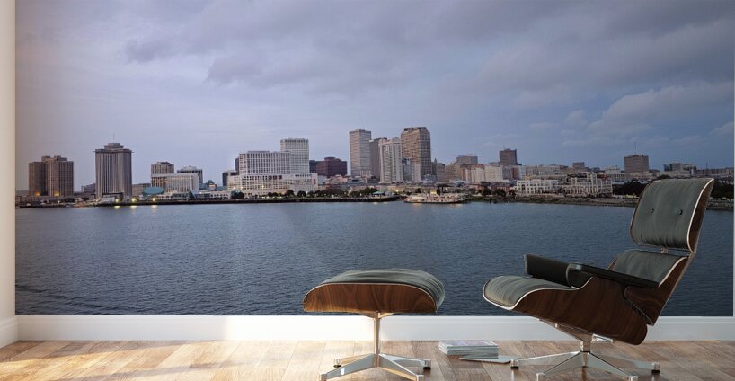 This stunning photograph captures the expansive view of the New Orleans skyline set against a calm Mississippi River. The cityscape features a mix of contemporary skyscrapers and charming historic buildings bathed in soft evening light under a sky filled with gentle fluffy clouds. The serene water stretches across the foreground creating a sense of tranquility and balance. Perfect for those looking to add a touch of urban sophistication and the vibrant essence of New Orleans to their wall decor this image beautifully represents the harmony between nature and city life.
