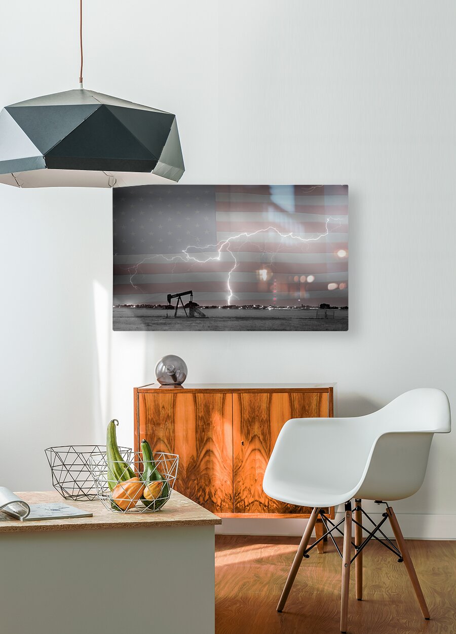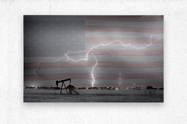 Eastern plains of the Rocky Mountain front range Weld County Colorado view of a pumpjack near the town of Dacona with a lightning thunderstorm strike near by. HDR Black and white with selective coloring and American USA Flag background. Colorado Fine art nature landscape lightning weather photography poster prints decorative canvas prints acrylic prints metal prints corporate artwork greeting cards and stock images by storm chaser James Bo Insogna aka The Lightning Man C - All Rights Reserved. *PLEASE NOTE WATERMARKS WILL NOT BE ON THE PURCHASE PRINTS*