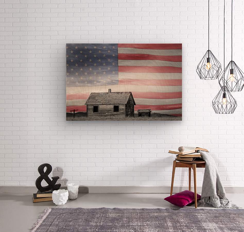 A rustic rural little country house on the prairie with a USA Flag background. Striking fine are nature landscape black and white selective color photography print canvas art and stock image by James Bo Insogna Copyright C 2012 - All Rights Reserved 1-888-682-0122. Fine Art Guaranteed to liven any decor. Great to decorate your home walls office walls cafe restaurant boardroom waiting room or almost any commercial space.