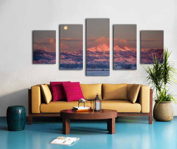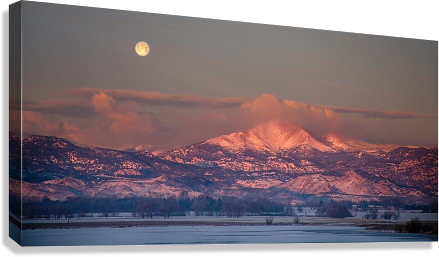 Panorama scenic landscape view on Feb. 5th 2015 -7:43 am full moon setting in the west behind the snow dusted majestic Colorado Rocky Mountains Twin Peaks Mount Meeker 13911 ft and Longs Peak 14256 ft as the sun is rising in the east. View from Longmont Colorado Boulder County. Colorado fine art nature landscape photography poster prints decorative canvas prints acrylic prints metal prints corporate artwork greeting cards and stock images by James Bo Insogna C - All Rights Reserved. Please feel Free to share our links with Family or Friends who may also enjoy them. If you like my Art Gallery please spread the word and press the Pinterest FB Google+ Twitter or SU Buttons! Thank you! *PLEASE NOTE WATERMARKS WILL NOT BE ON THE PURCHASE PRINTS*