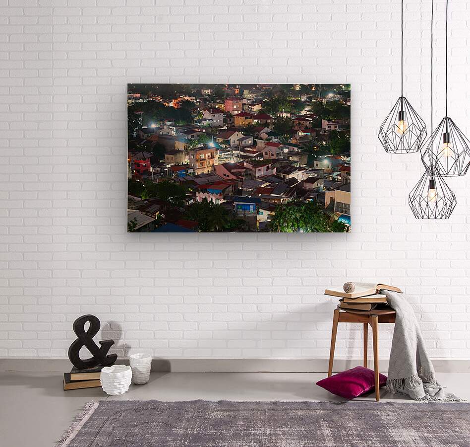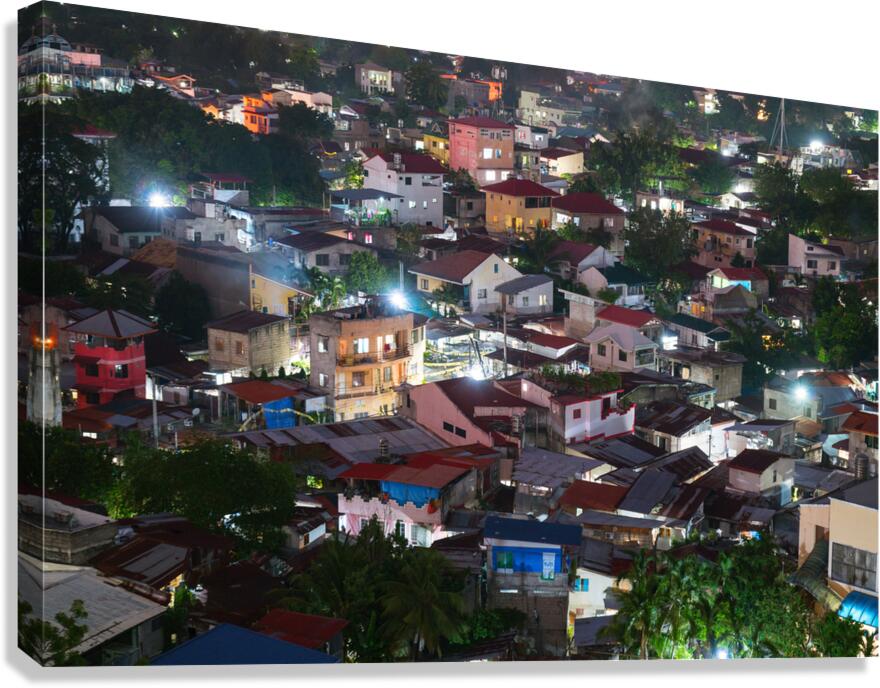 This fine art night photograph captures the intimate charm of a densely populated urban neighborhood at twilight. The image taken from an elevated perspective reveals a patchwork of rooftops and dwellings bathed in the warm scattered light of street lamps and home interiors. The scene is a symphony of textures from the corrugated metal roofs to the lush foliage peeking through the built environment. The deliberate focus on the interplay of light and shadow creates a sense of depth and invites the viewer to explore the stories hinted at within this vibrant community. The soft ambient light lends a painterly quality to the scene highlighting the beauty found in the everyday urban landscape.