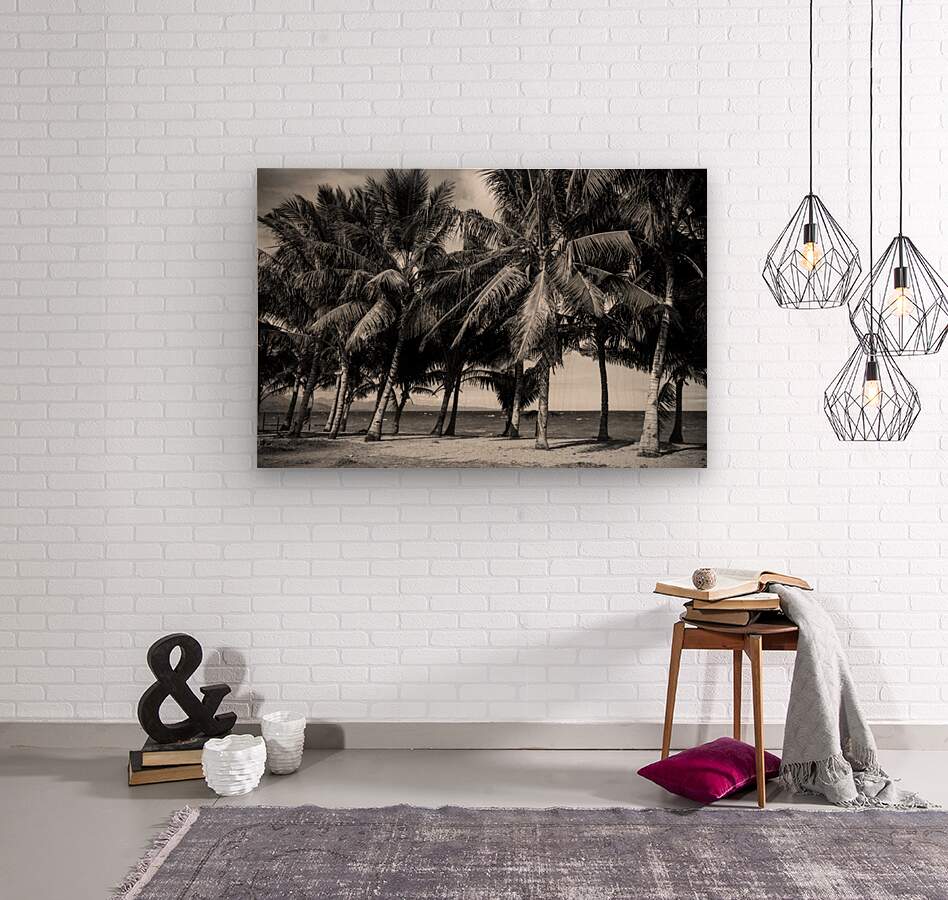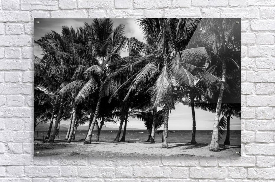 A row of palm trees lining a Negros Oriental Island sandy beach creating a scene of stark beauty. The image is composed with a focus on texture and contrast emphasizing the fronds of the palm trees against a cloudy sky. The trees are captured in varying shades of gray their silhouettes standing out against the lighter background. The sandy beach in the foreground provides a sense of depth and perspective while the suggestion of a distant shoreline adds a touch of mystery. The overall effect is one of quiet drama highlighting the natural beauty of the tropical landscape through the lens of monochrome photography.