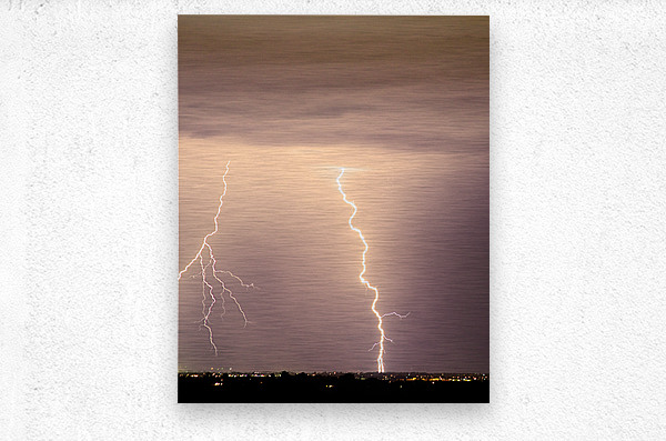 Lightning Bolt with a fork striking the horizon of city lights. C 2011 James Insogna Fine Art lightning photography print Stock Image and Canvas Art. ...[+]