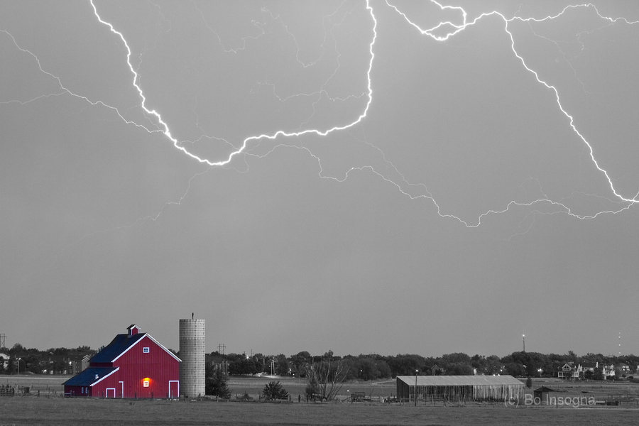 Cloud to cloud lightning striking above a Red Barn at McIntosh Farm and museum open space in Longmont Colorado Boulder County. This storm came in fast and left the same way heading to the northeast out toward Ft Collins and Greeley. There were some really cool C2C strikes. Missed a couple good ones as the strikes were far apart. Settings for this shot: ISO 100 - 4sec - f8 - 70mm. Black and white with selective coloring. Fine art nature landscape photography prints decorative canvas prints acrylic prints and stock images by By James Bo Insogna C 2012 - All Rights Reserved. 1-888-682-0122