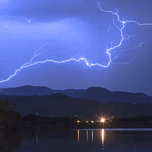 One long lightning bolt strike acr4oss the sky above McIntosh Lake in Longmont Colorado with a western view to th foothills of the Rocky Mountains. Li...[+]