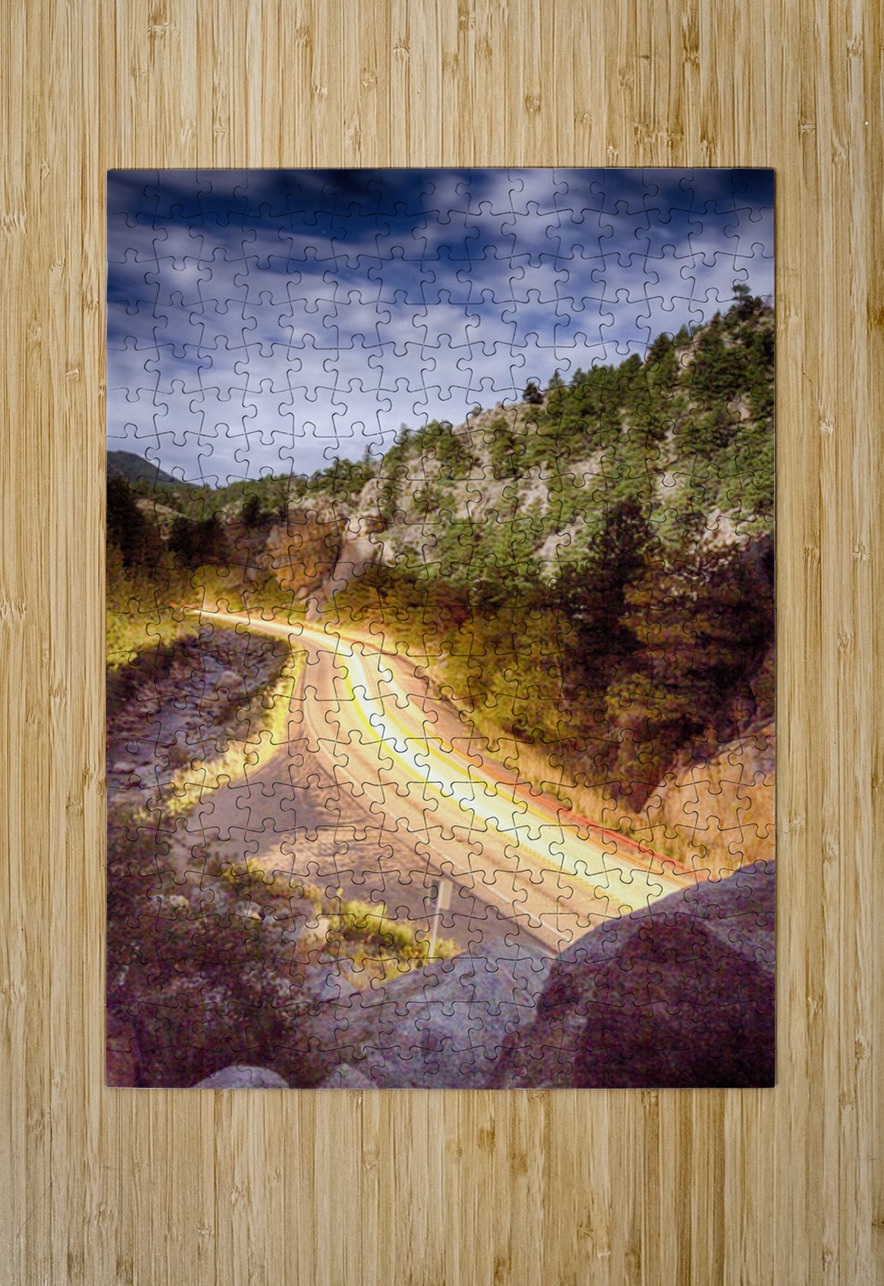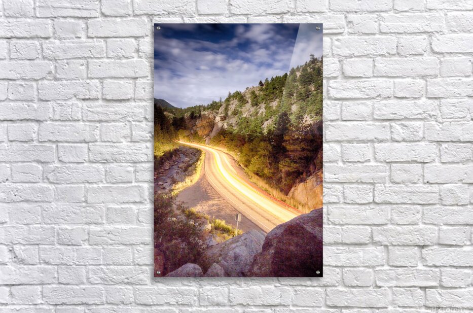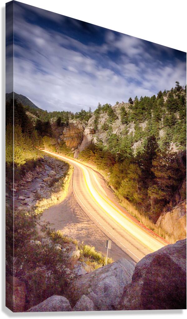 Boulder Canyon Beams Of Light from a Long exposure of a night time landscape scenic view of car light trails blazing up and down the Boulder Canyon with a few stars in the sky. Boulder County Colorado. Boulder Canyon is Carved by the rushing waters of Middle Boulder Creek popular for scenic driving fishing and rock climbing. Land in this area is a mix of city county national forest and private lands. 18 miles from Boulder Population: 98889 Altitude elevation:5430 feet up to Nederland Population: 1337 Altitude elevation: 8230 feet . Boulder Creek is a 31.4-mile-long creek draining the Rocky Mountains to the west of Boulder Colorado as well as the city itself and surrounding plains. Middle Boulder Creek rises as two forks from the Continental Divide: the North Fork rises in a cirque below Mount Neva and flows 7.5 miles to the South Fork The South Fork rises at Rollins Pass on the Continental Divide and flows 5.5 miles to the North Fork. From the junction of the two forks Middle Boulder Creek 13.7 miles long flows east through the towns of Eldora and Nederland into Barker Meadow Reservoir a water supply for the city of Boulder before joining North Boulder Creek to form the main stem of Boulder Creek. Colorado Fine art nature landscape photography poster prints decorative canvas prints acrylic prints metal prints corporate artwork greeting cards and stock images by James Bo Insogna C - All Rights Reserved. *PLEASE NOTE WATERMARKS WILL NOT BE ON THE PURCHASE PRINTS*