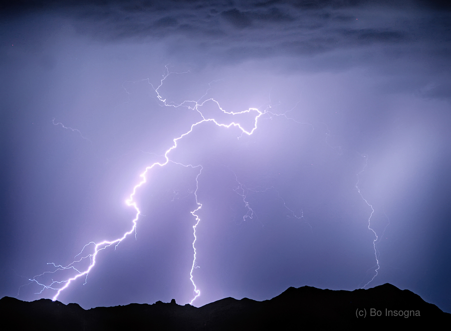 An electrical thunderstorm lightning discharge above the McDowell Mountains in Scottsdale Arizona. During July and August you can watch nightly shows of lightning striking around these mountains and desert. The McDowells share borders with the cities of Fountain Hills Scottsdale and Maricopa County. The city of Scottsdale has made its share of the McDowells a preserve and has set up a wide trail network in partnership with the McDowell Sonoran Conservancy. When lightning strikes sand or rock the extreme heat can fuse minerals beneath the surface into a tube called a fulgurite. The energy contained in a single lightning strike can power a 100 Watt light bulb for 90 days. In the Middle Ages it was believed that church bells expelled evil spirits. Thunder and lightning were regarded as diabolical so during a thunderstorm monks tried to constantly ring the bells. As a result the victims of lightning very often were bell-ringers. Photo: ? James Bo Insogna