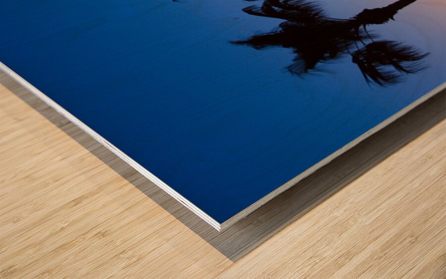 Tall palm trees rise like graceful sentinels against a fading sky brushed with deep indigo and molten orange. Captured at the golden hour the silhouet...[+]