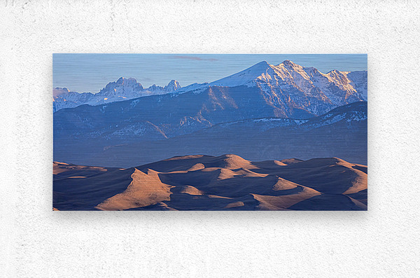 Early Morning Sand Dunes and Snow Covered Peaks  Wood print