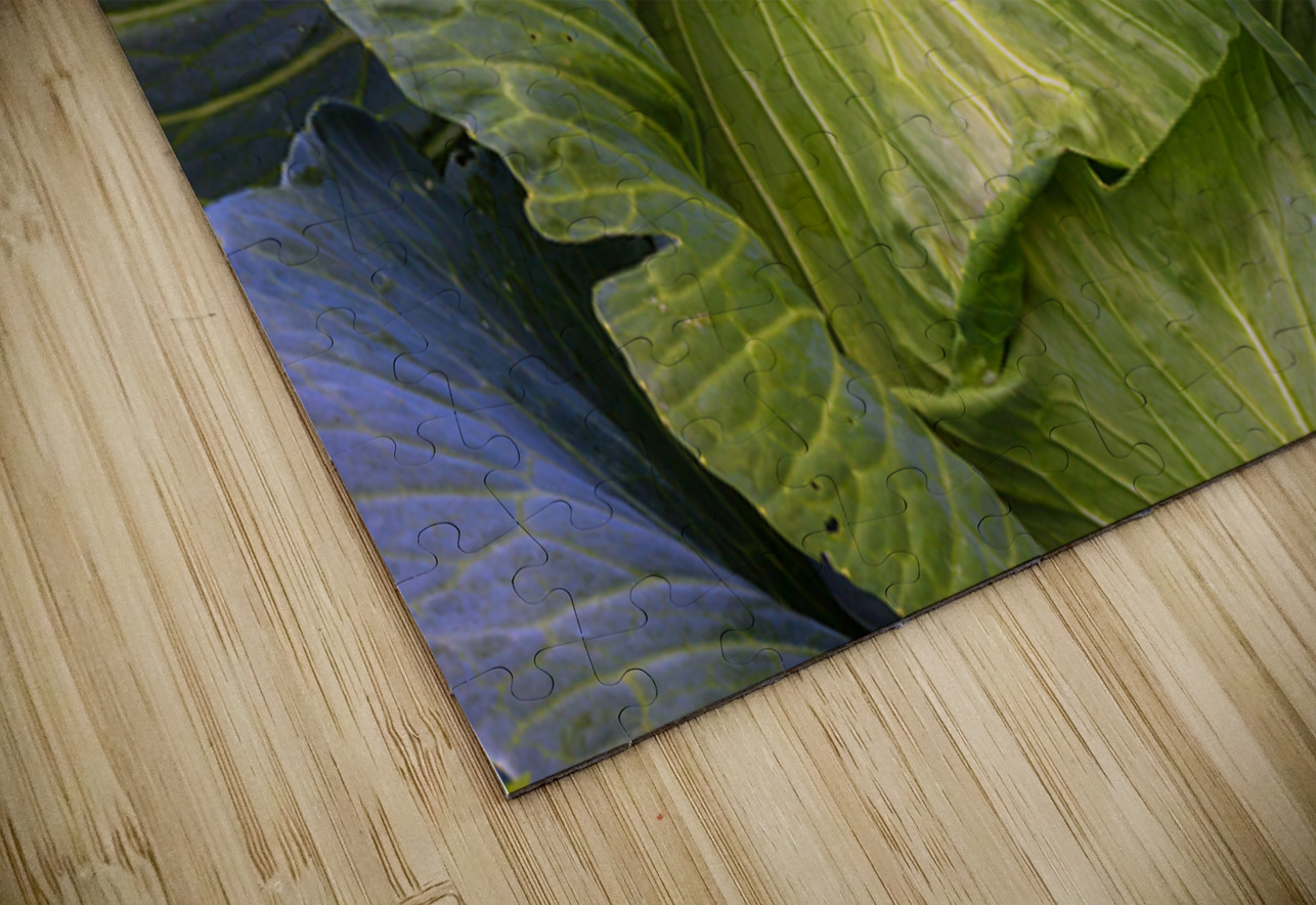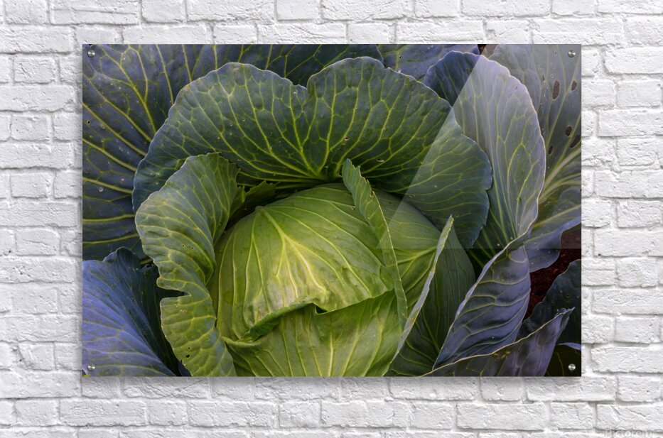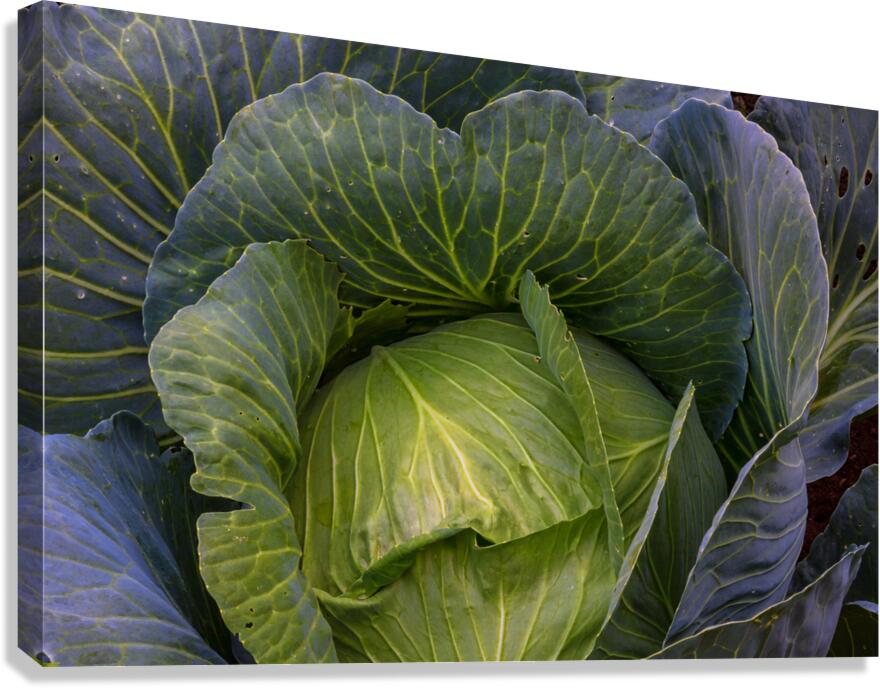 A captivating fine art photograph revealing the lush intricate beauty of a vibrant green cabbage. The image highlights the detailed network of veins across its broad curving leaves and the subtle purple hues hinting at its depth creating a rich tapestry of natural texture and form. This piece celebrates the organic artistry found in the garden bringing a fresh grounding presence to any kitchen dining area or living space. A perfect choice for those who appreciate the subtle elegance of natures design. Limited Edition.