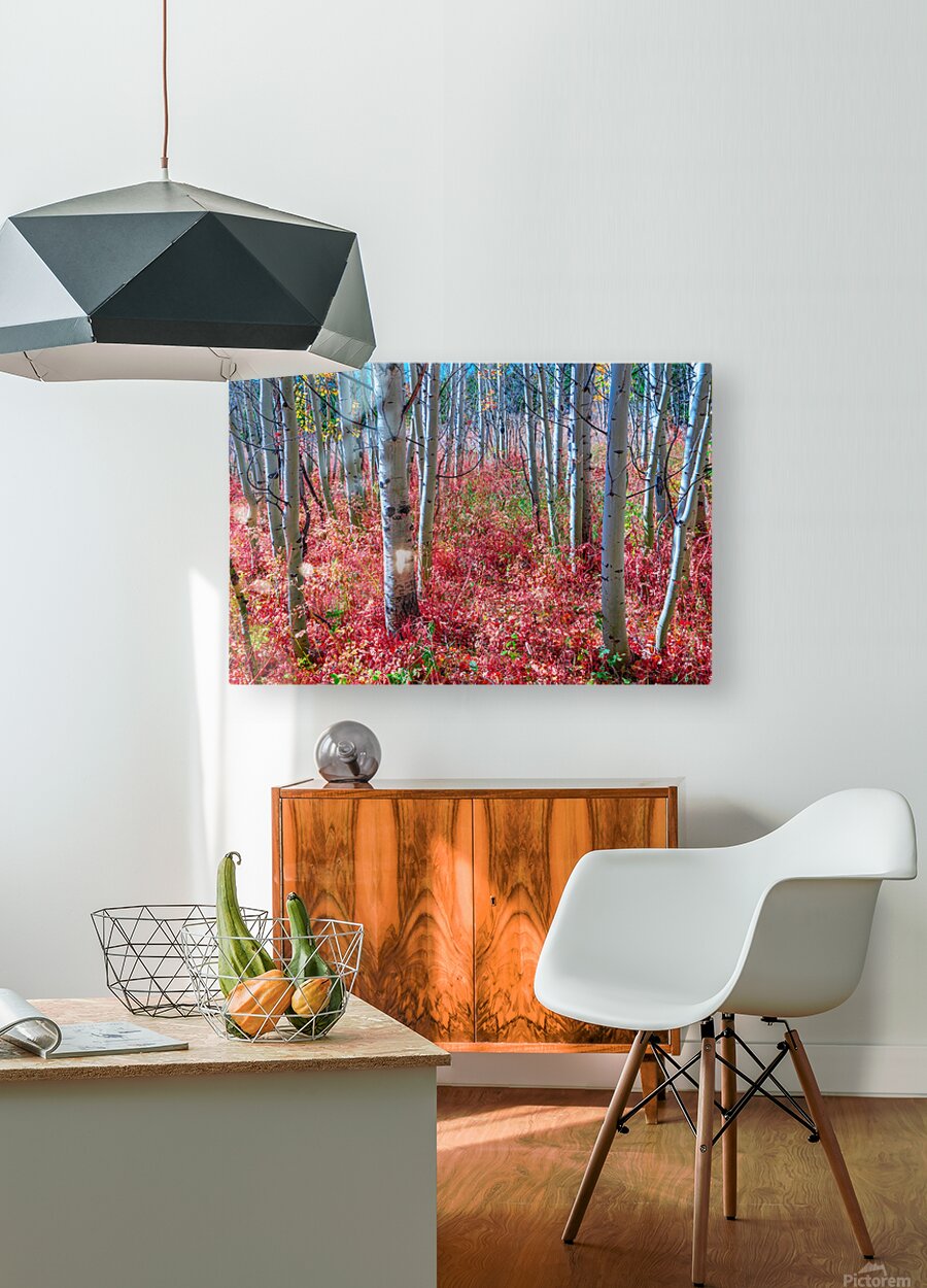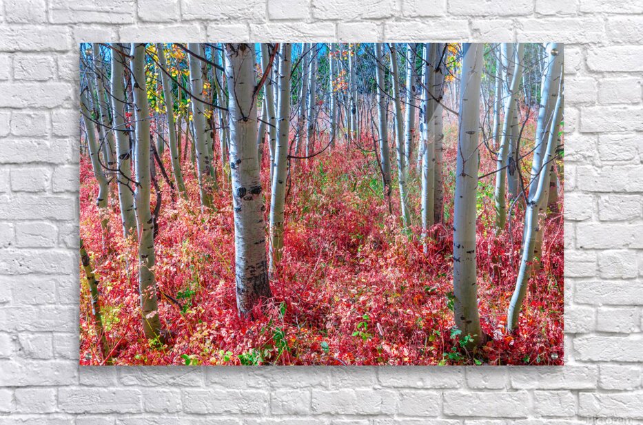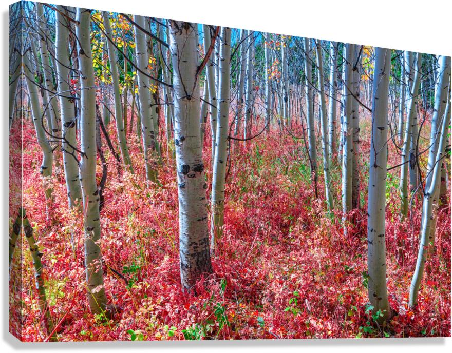 An enchanting fine art photograph capturing the breathtaking beauty of an aspen forest bathed in the vibrant hues of autumn. Slender silvery-white aspen trunks rise gracefully from a dense fiery red carpet of undergrowth creating a dramatic and immersive landscape. The soft dappled light filters through the canopy enhancing the brilliant fall colors and evoking a sense of tranquil wonder. This captivating piece offers a vivid glimpse into natures seasonal artistry perfect for bringing the serene majesty of an autumnal woodland into any living space office or gallery.