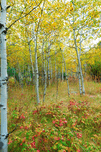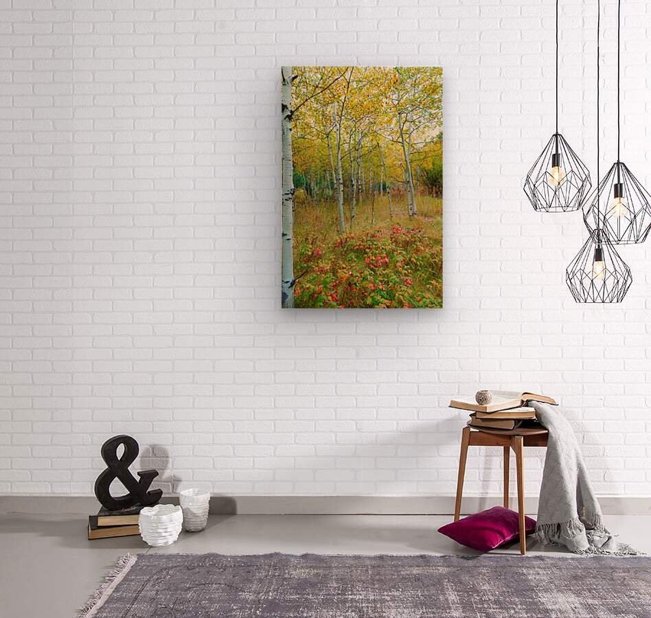 A breathtaking fine art photograph capturing a vibrant aspen grove in the peak of fall. This image features the classic white trunks of the trees set against a brilliant canopy of golden leaves. The forest floor is a stunning mix of grasses and bushes ablaze with fiery red and orange foliage creating a dynamic and colorful scene. This piece beautifully encapsulates the essence of the autumn season making it a perfect addition to any space seeking a touch of natural beauty and serene energy.