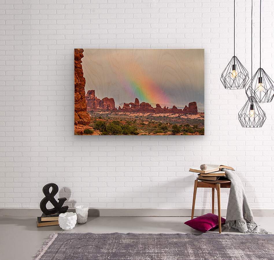 This fine art print captures a stunning rainbow arcing over the iconic red rock formations of Arches National Park. The photograph showcases the unique beauty of the American Southwest blending the ephemeral wonder of a rainbow with the timeless majesty of the desert landscape. Its a perfect piece of wall art for nature lovers and collectors seeking to bring the tranquility and vibrant color of the Utah desert into their home.