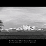 This panoramic black and white photograph captures the majestic Twin Peaks of Rocky Mountain National Park: Longs Peak and Mount Meeker. The image fra...[+]
