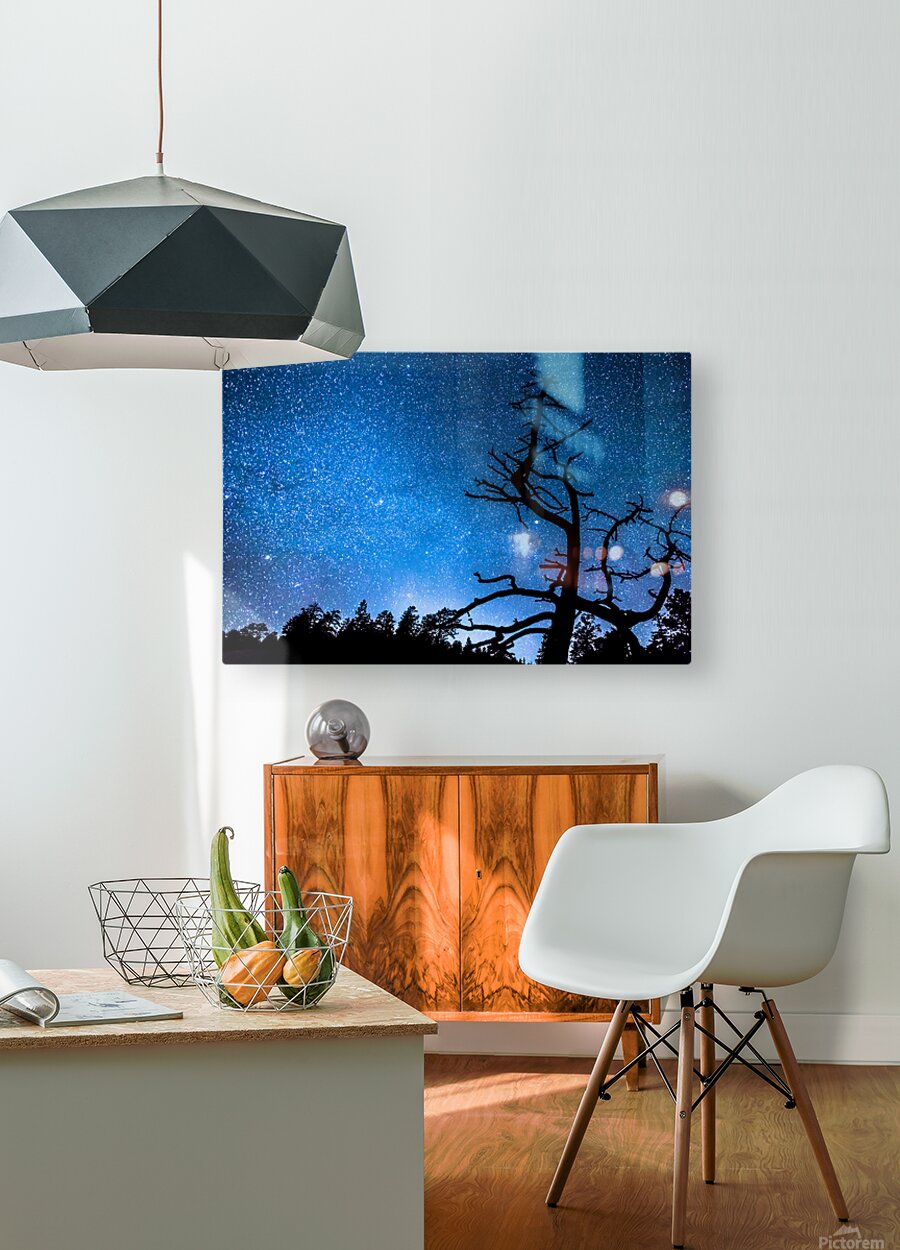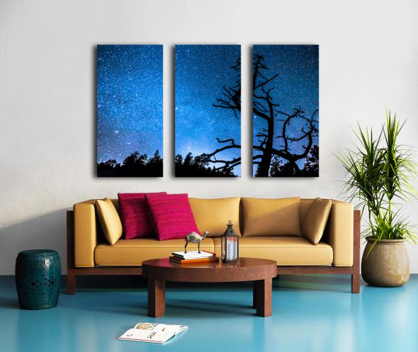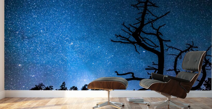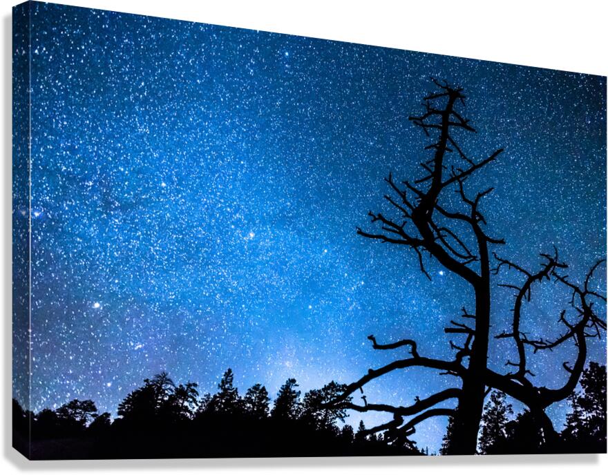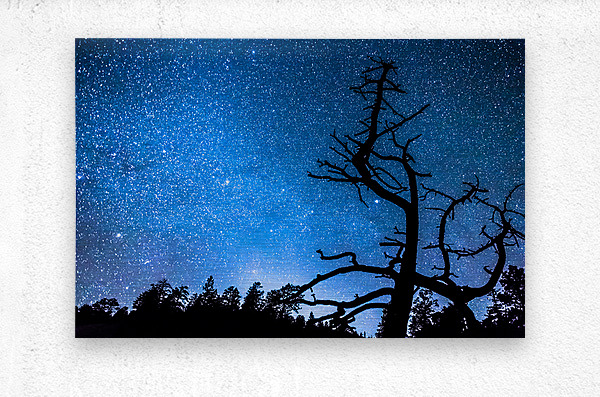 The image captures the majestic night sky over Bryce Canyon a certified International Dark Sky Park. A prominent silhouette of a gnarled solitary tree stands against a vibrant star-filled firmament showcasing the ethereal beauty of astrophotography. The deep blue tones of the heavens speckled with countless stars and the faint glow of the Milky Way provide a stunning contrast to the dark terrestrial foreground. This fine art photograph embodies the serene and untouched nature of Utahs unique landscape after sunset making it a perfect piece for home or office decor.