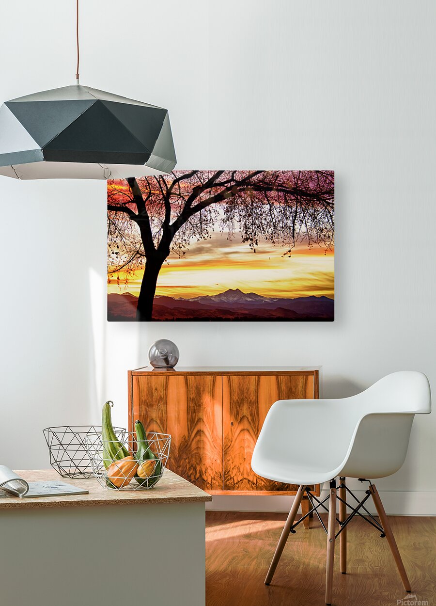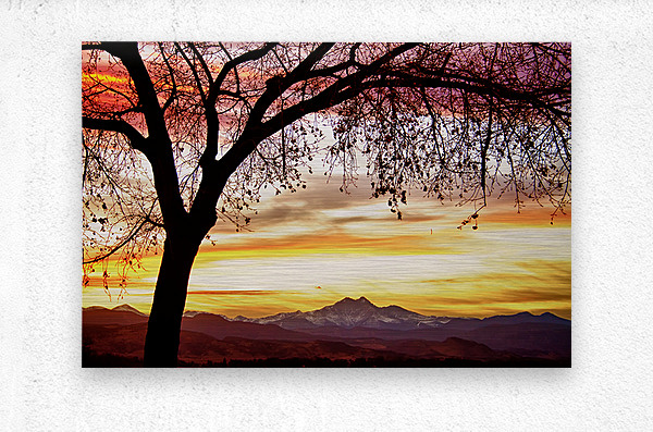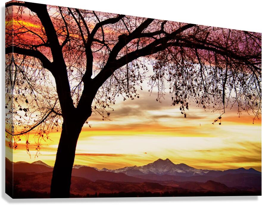 A breathtaking fine art photography print capturing a vivid sunset sky over the Colorado Front Range. Framed by the silhouette of a large tree the scene reveals the iconic Twin Peaks Mount Meeker at 13911 feet and Longs Peak at 14256 feet rising majestically above Boulder County. Perfect as wall art this image blends nature?s drama with timeless mountain beauty.