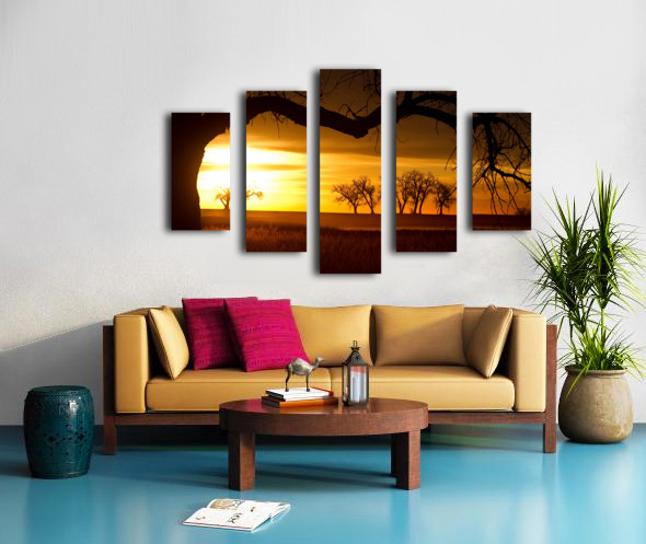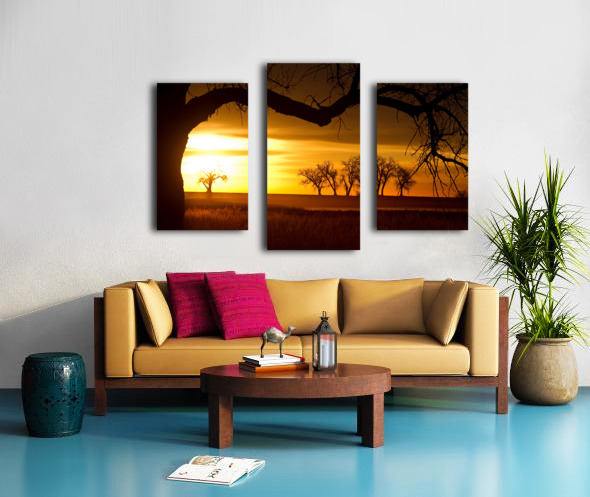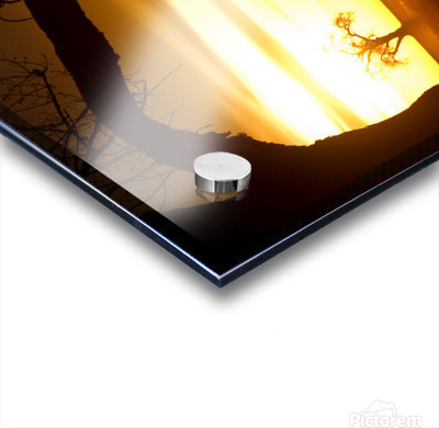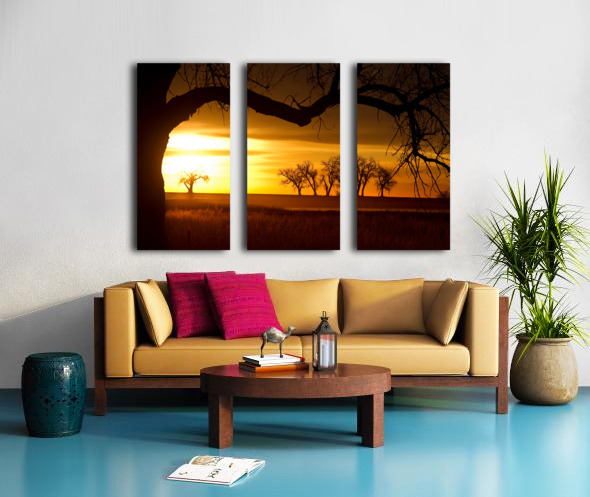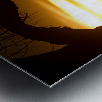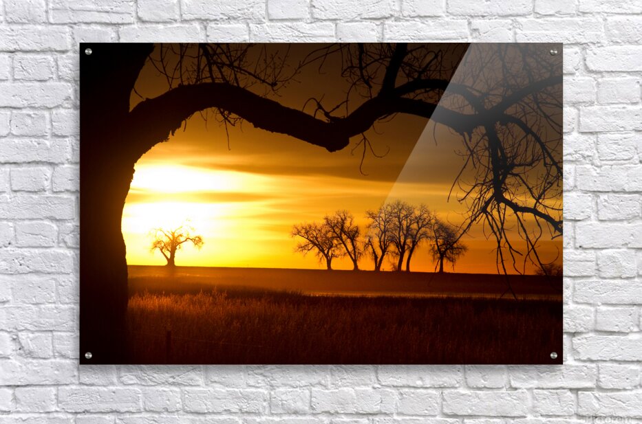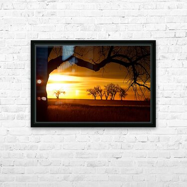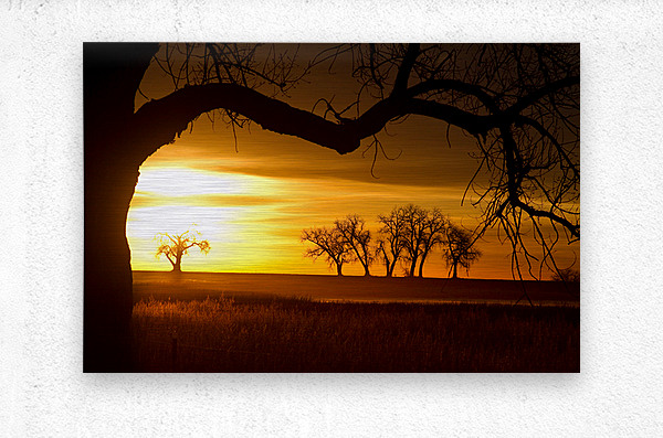 A radiant fine art photography print capturing the golden glow of sunrise across an open meadow. Silhouetted trees stand gracefully against the warm horizon their branches framing the morning light in a poetic embrace. Perfect for wall art this image brings the quiet beauty of dawn and nature?s timeless serenity into any space.