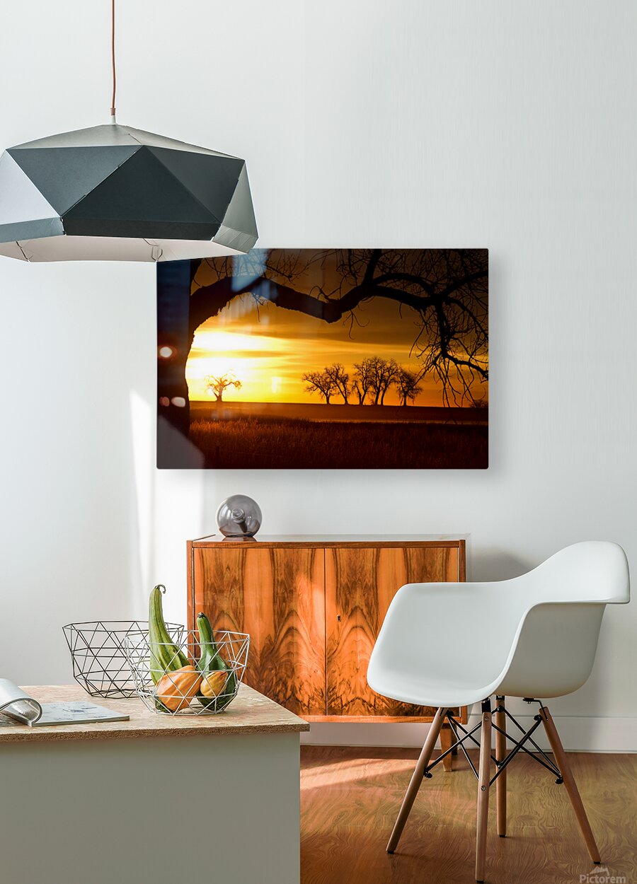 A radiant fine art photography print capturing the golden glow of sunrise across an open meadow. Silhouetted trees stand gracefully against the warm h...[+]