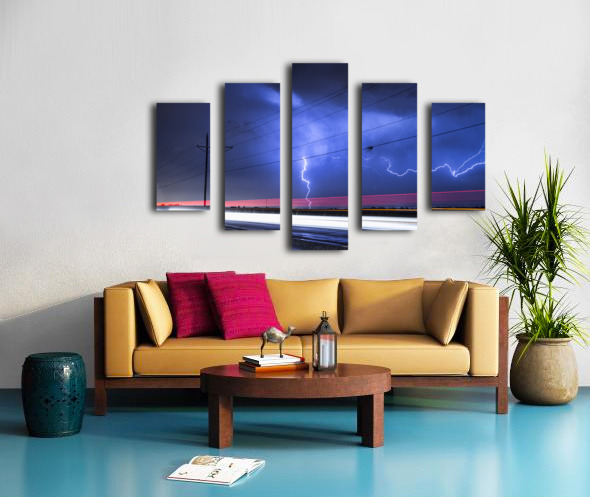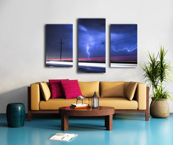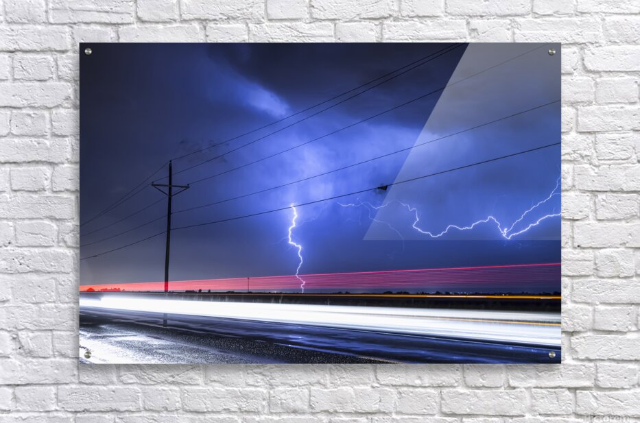 A vivid lightning bolt strikes across the night sky illuminating storm clouds above an open highway. Long exposure captures the glowing streaks of vehicle lights contrasting the raw energy of nature with the flow of modern life. This fine art photography wall art print offers a bold and electrifying atmosphere for contemporary spaces.