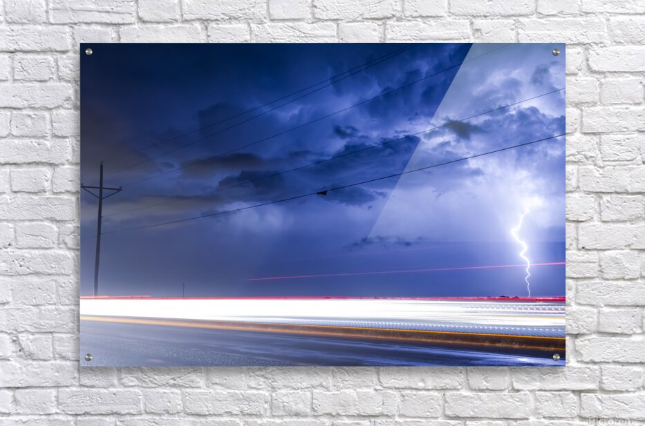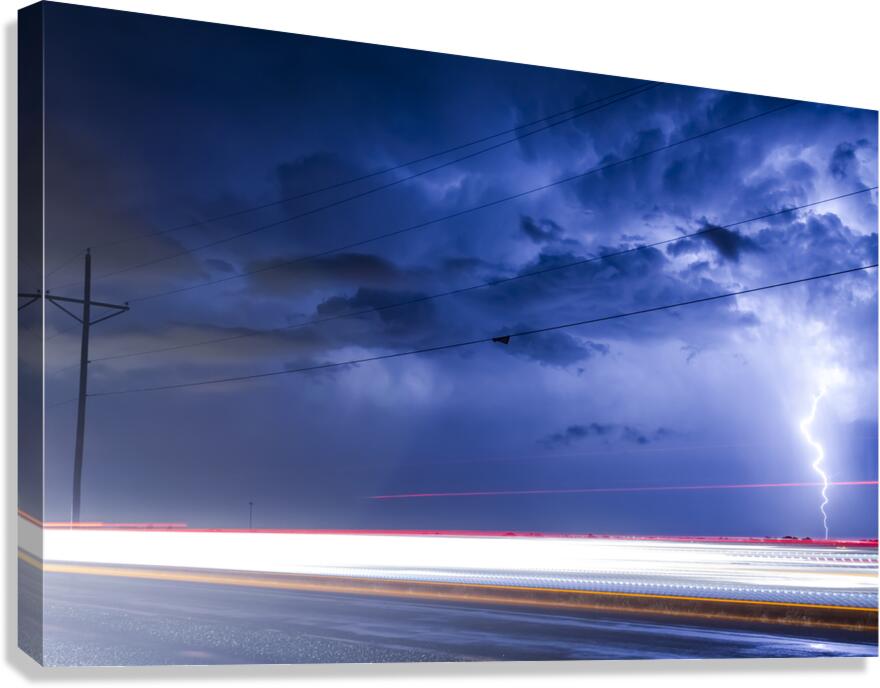 Capture the raw energy of nature with this striking long-exposure photograph. A brilliant bolt of lightning illuminates a dramatic dark blue storm sky contrasting sharply with the vibrant red and white light trails streaking along the highway pavement below. This moody cinematic image perfectly blends the intensity of a severe thunderstorm with the dynamic motion of modern life making it a captivating piece of fine art wall decor for any contemporary space.