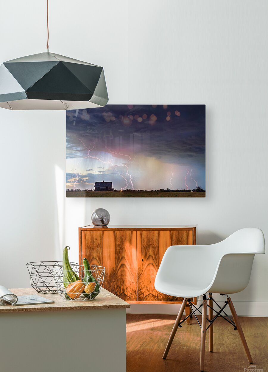 ABOUT THIS ARTWORK: PINK LIGHTNING STORM MULTIPLE STRIKES PRAIRIE FARMHOUSE