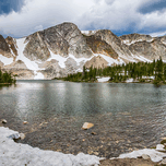 This captivating fine art photography print presents a scenic lake view of the Medicine Bow Snowy Mountain Range in Wyoming, a majestic segment of the...[+]