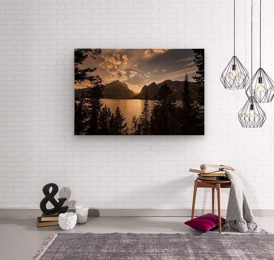 This breathtaking fine art photography print captures a moment of sublime beauty over Jenny Lake in Grand Teton National Park, Wyoming. The scene is dramatically framed by dark pine tree silhouettes, drawing the eye to the brilliant sunset or sunrise alpenglow bursting between the rugged Teton peaks. The luminous golden light spills across the tranquil lake surface, creating a shimmering path of reflection under a sky painted with warm orange and gold clouds. This piece exudes a deeply romantic and atmospheric feel, perfect for wall art that brings the peaceful yet dramatic spirit of the Wyoming wilderness into your home. A magnificent choice for luxury nature decor and collectors of celestial landscape photography. © James Bo Insogna