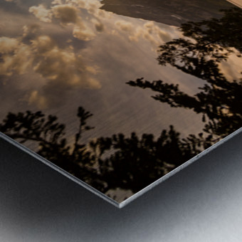 This breathtaking fine art photography print captures a moment of sublime beauty over Jenny Lake in Grand Teton National Park, Wyoming. The scene is dramatically framed by dark pine tree silhouettes, drawing the eye to the brilliant sunset or sunrise alpenglow bursting between the rugged Teton peaks. The luminous golden light spills across the tranquil lake surface, creating a shimmering path of reflection under a sky painted with warm orange and gold clouds. This piece exudes a deeply romantic and atmospheric feel, perfect for wall art that brings the peaceful yet dramatic spirit of the Wyoming wilderness into your home. A magnificent choice for luxury nature decor and collectors of celestial landscape photography. © James Bo Insogna