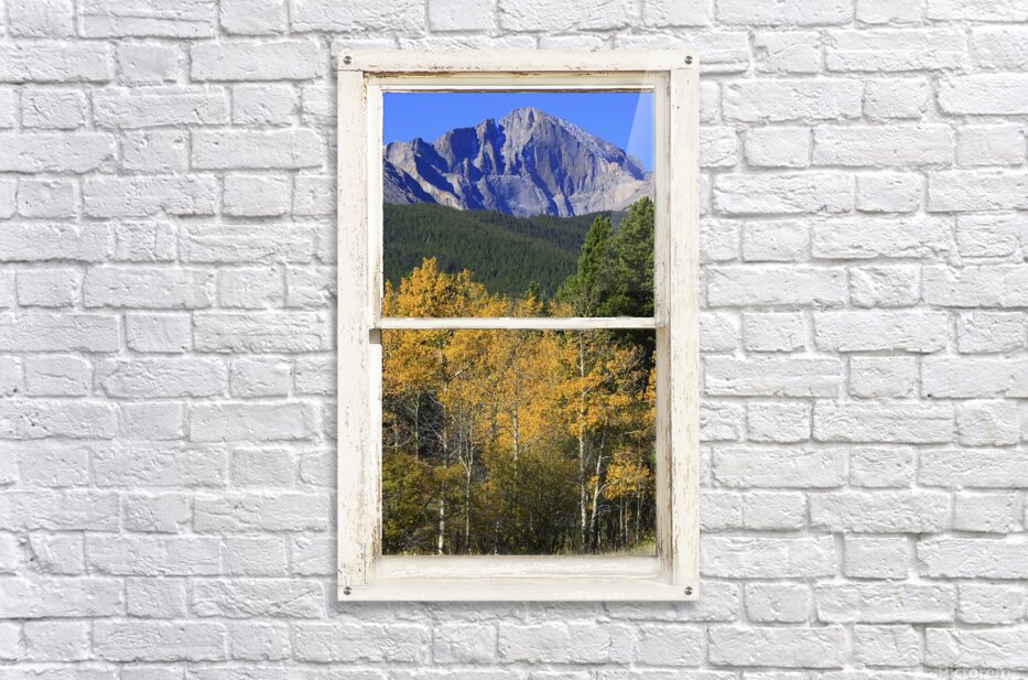 A majestic fine art composite photograph capturing the stunning view of Longs Peak one of Colorados iconic 14ers framed within a rustic white window. The upper pane showcases the dramatic mountain peak against a clear blue sky rising above dark evergreen forests. The lower pane reveals a vibrant foreground of golden yellow aspen trees in full autumn color evoking the beauty of Rocky Mountain National Park. This piece is perfect for wall art decor bringing the serene and powerful landscape of the Colorado Rockies into your home. Ideal for nature lovers and collectors of mountain fine art photography.