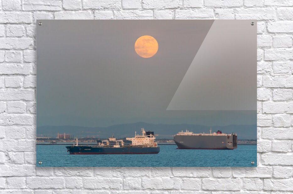 A compelling fine art photograph capturing a luminous full moon rising above the Port of Los Angeles with cargo ships anchored across calm Pacific wat...[+]