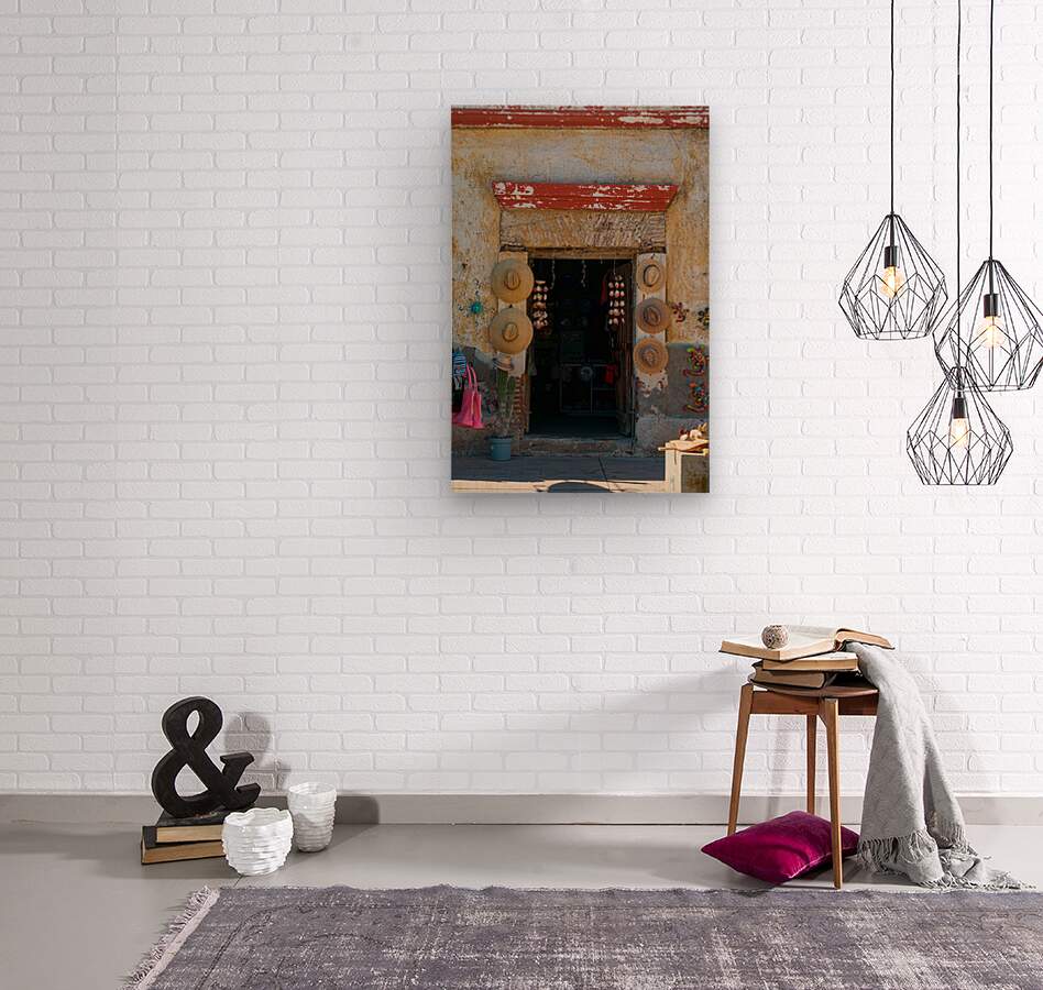 A character-rich street photography image captured in Mexico featuring a rustic shop entrance framed by weathered stucco walls and a wooden doorway adorned with traditional straw hats and handcrafted souvenirs. The aged textures earthy tones and authentic local details convey the timeless charm of everyday Mexican culture making this photograph ideal for fine art wall decor travel photography collections and admirers of cultural and architectural storytelling.