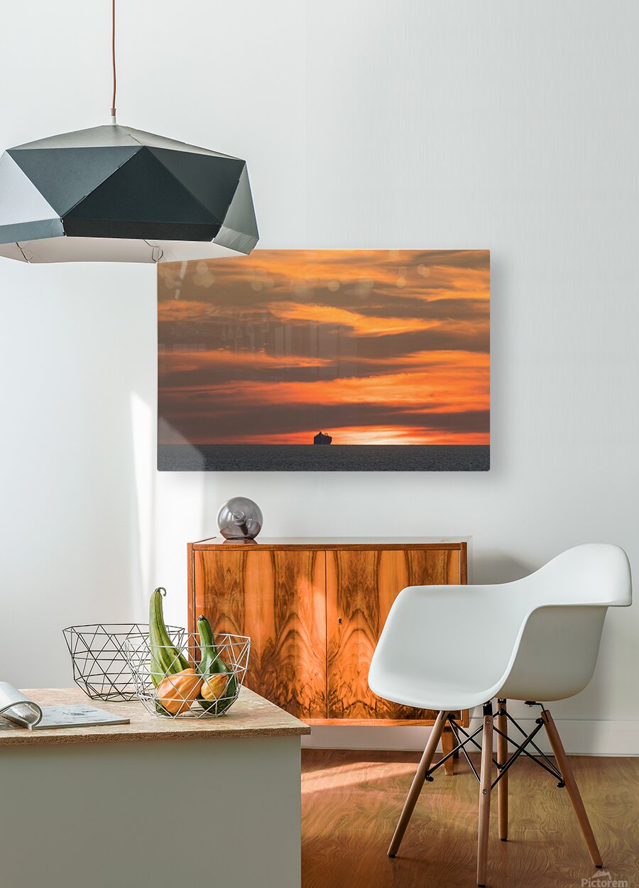 A serene ocean sunset photograph capturing the Island Princess cruise ship silhouetted against a glowing sky as it sails out of Puerto Vallarta Mexico. Layers of warm orange and gold clouds reflect across the Pacific horizon creating a timeless maritime scene that blends travel tranquility and the romance of open water ideal for fine art wall decor cruise enthusiasts and coastal photography collectors.