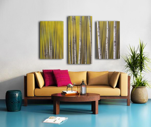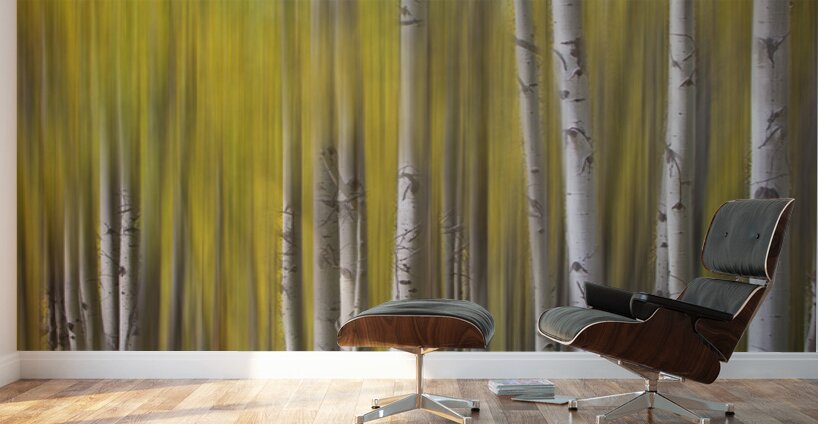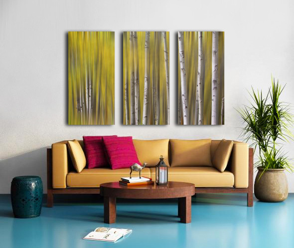Bring the serene beauty of the Colorado wilderness into your home with Somewhere Along The Road Dreaming an evocative fine art photography print by James Bo Insogna. This stunning vertical motion blur artwork captures a grove of white aspen trees against a backdrop of vibrant autumn gold and soft forest greens. Using an intentional camera movement technique this piece transforms a classic forest landscape into a dreamlike impressionistic masterpiece. Perfectly suited for modern decor this abstract nature print offers a calming sophisticated atmosphere for living rooms bedrooms or professional office spaces. Available in high-quality canvas acrylic or metal finishes to suit any luxury interior design.