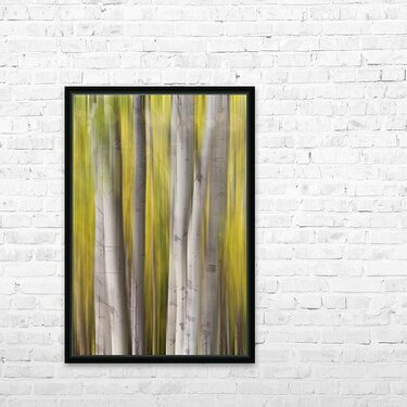 A luminous abstract forest composition where silver-white aspen trunks rise through flowing veils of golden autumn motion creating a tranquil and dreamlike landscape. This fine art photograph blends natural elegance with modern abstraction making it a refined wall art print for contemporary interiors luxury home d?cor gallery walls and curated art collections.