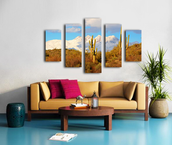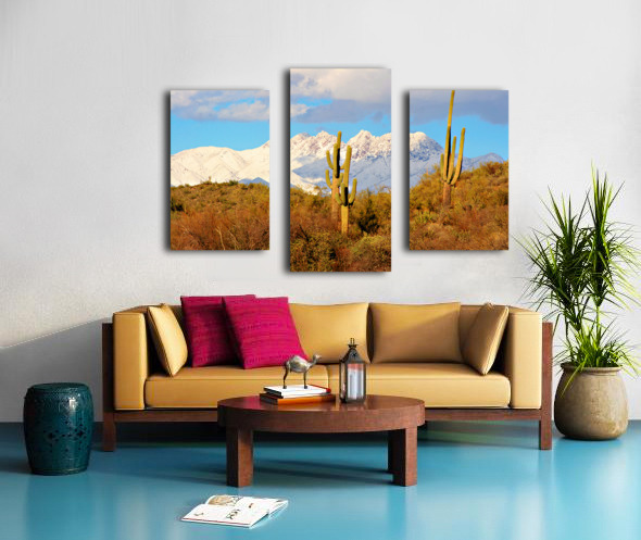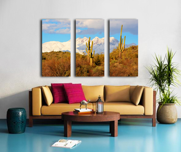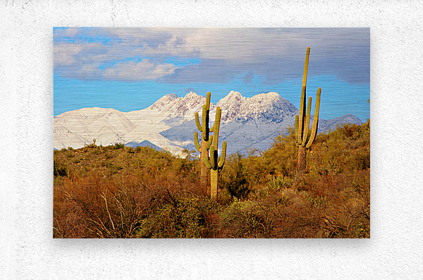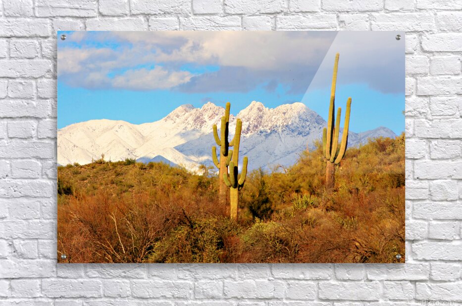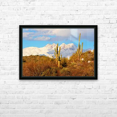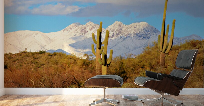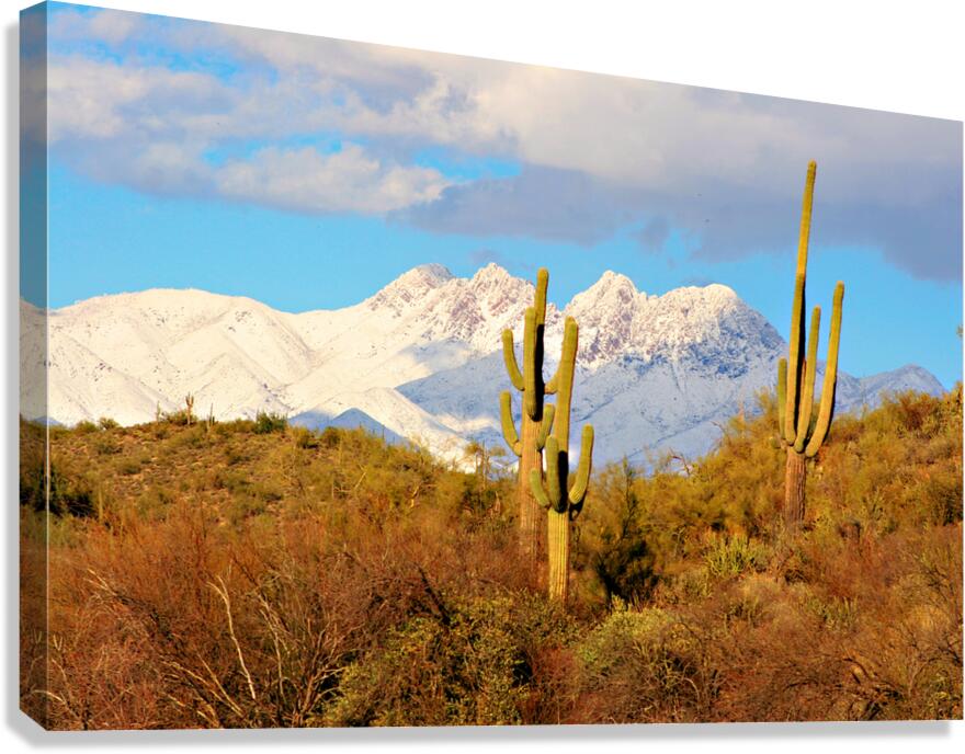 The Lush Arizona desert with giant saguaro cactus and a view of the snow covered Four Peaks. Four Peaks at 7657 feet 2335 m in altitude is a prominent landmark on the eastern skyline of Phoenix part of the Mazatzal Mountains. It is located in the Tonto National Forest 40 miles east-northeast of Phoenix in the 60740-acre Four Peaks Wilderness. On rare occasions Four Peaks offers much of the Phoenix metro area a view of snow covered peaks and is the highest point in Maricopa County. A striking Arizona nature landscape capturing the iconic Four Peaks rising above the Sonoran Desert where towering saguaro cacti and warm desert brush contrast against snow-dusted mountain summits. This fine art composition blends rugged beauty with serene atmosphere creating a powerful wall art piece for luxury interiors gallery walls and curated Southwest art collections.