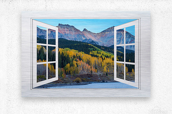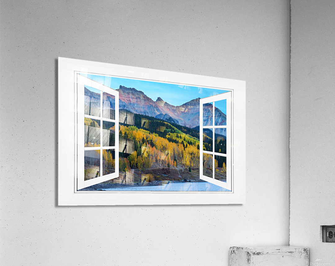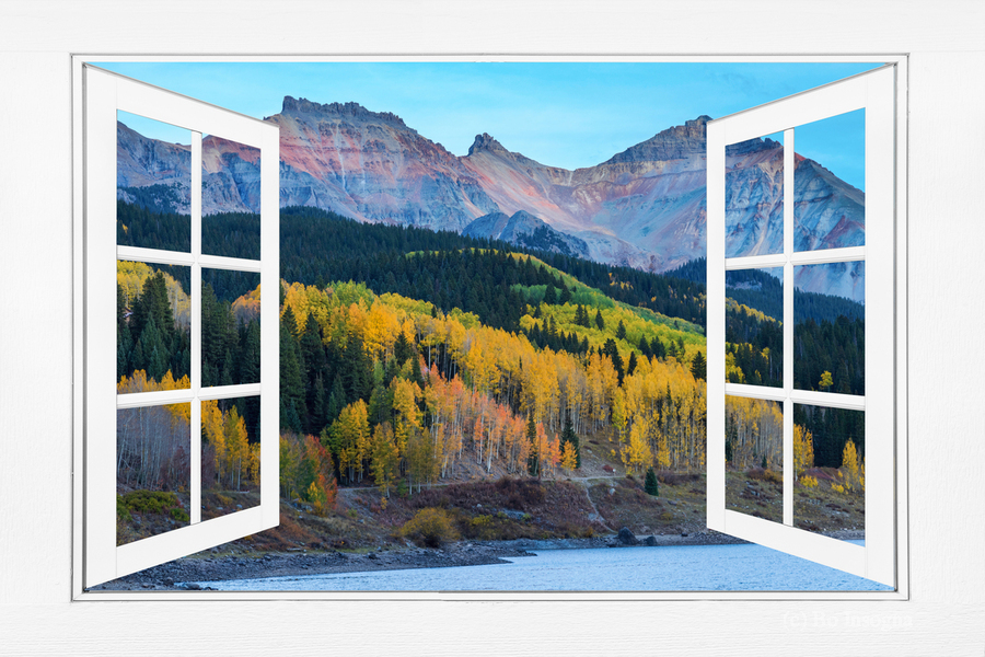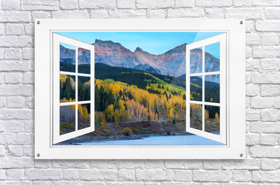 Scenic autumn view of Trout Lake near Telluride Colorado and Yellow Mountain North towering in the background view through an open white picture window frame. A fantasy fine art photography window optical illusion into the nature of a mountain lake view. A fantastic window to have in a bedroom, basement, office, or kitchen... all for a room with a view. Bring nature indoors now you can add a window with a view to any room in your home or office with our picture window frame fine art striking photography nature landscape art prints. The IMAGE is the FRAME how cool is that! Question: Do you have a home or office room without any windows? Do you want to set the mood in a room decor? Do you dream of a room with a view? The Answer: Now you can have a window with a view in any room with our NEW picture window frame fine art striking photography nature landscape prints all with a view and ready to hang by photographer James Bo Insogna - All Rights Reserved. This is an incredible way to decorate your office walls home walls cafe restaurant boardroom waiting room trade booth corporation or almost any commercial space. Museum-quality art with fast secure worldwide shipping to your door.