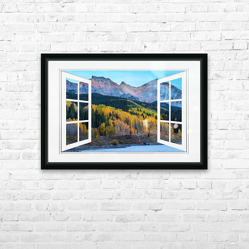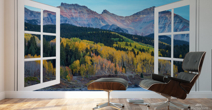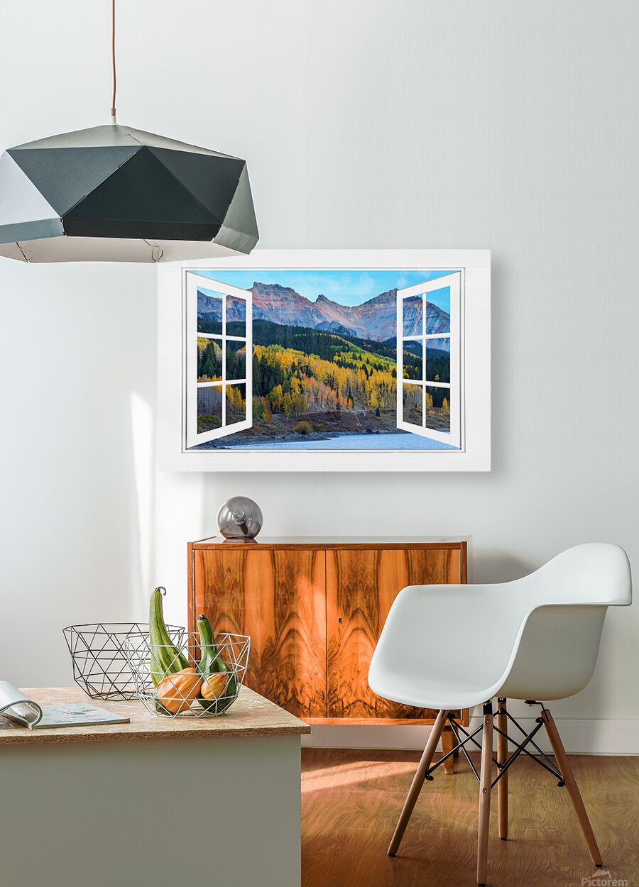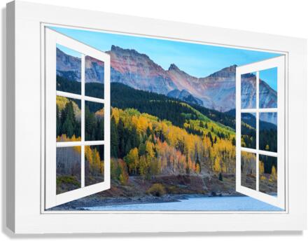 Scenic autumn view of Trout Lake near Telluride Colorado and Yellow Mountain North towering in the background view through an open white picture windo...[+]