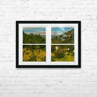Rocky Mountain autumn season view through a classic white distressed rustic whitewashed picture window. Your very own private window view into the mo...[+]