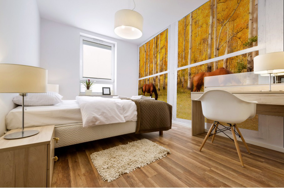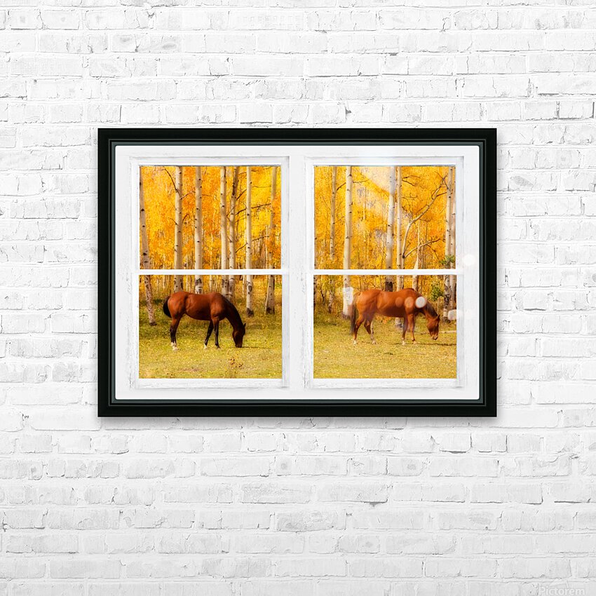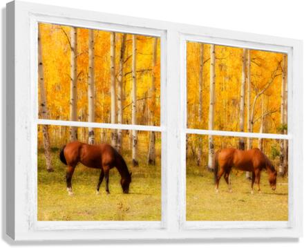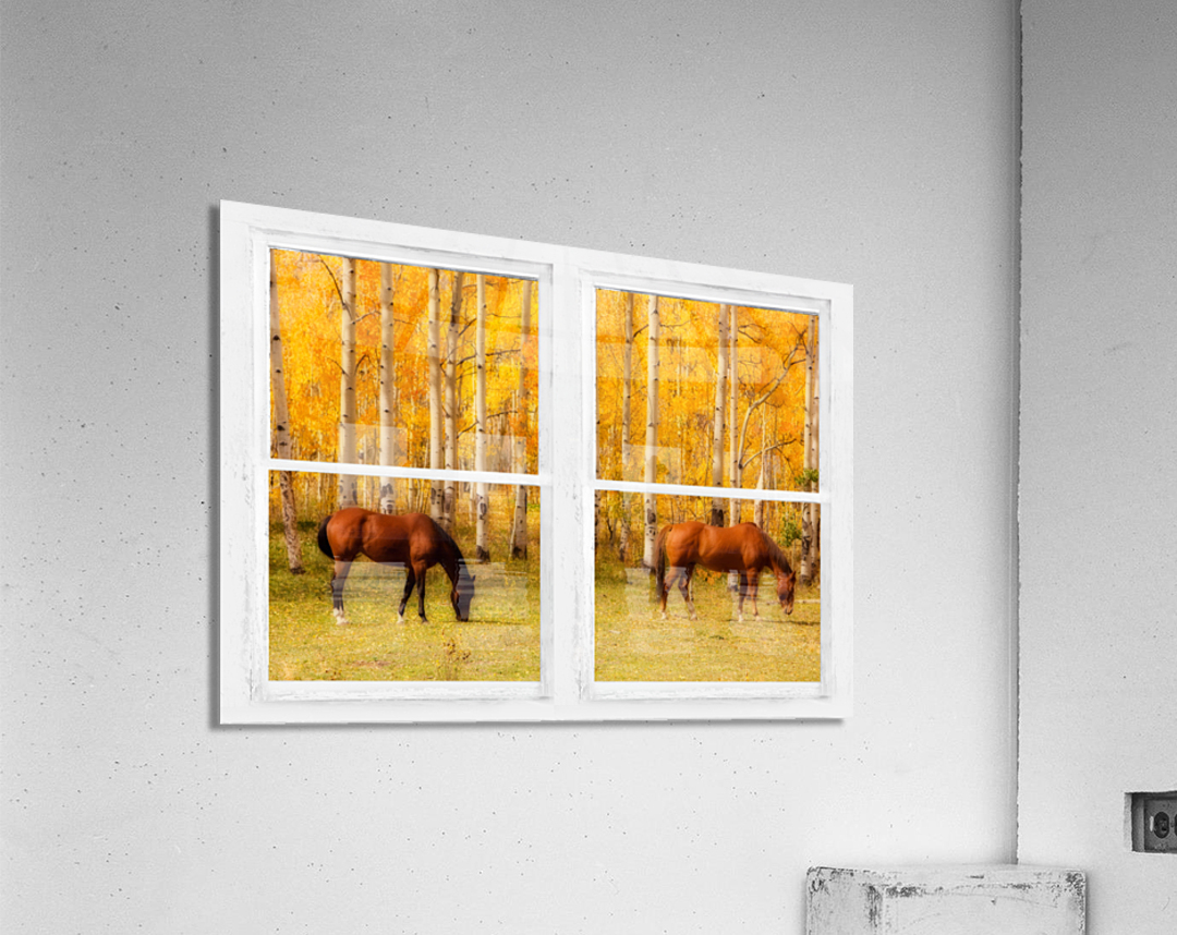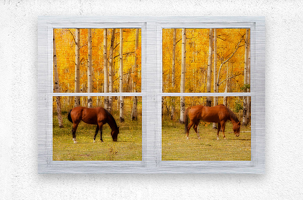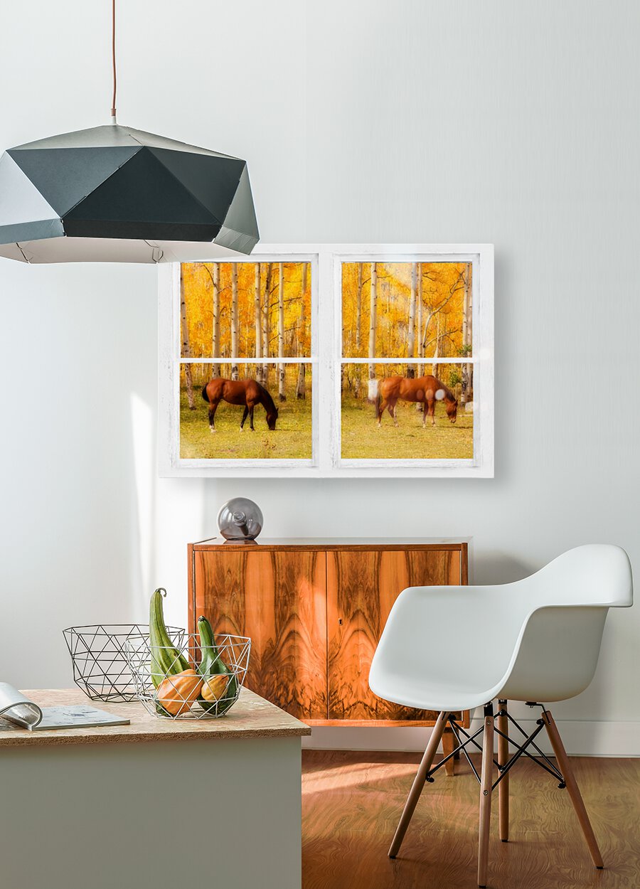 Two horses grazing in a meadow and towering autumn aspen trees with a view through a classic white distressed rustic whitewashed picture window. Your very own window view into colorful mother nature beautiful vacation view or for motivation. Create a fine art photography optical illusion to your decor of the beautiful colorful country equine view through an old distressed rustic white window . Bring nature indoors now you can add a window with a view to any room in your home or office with our picture window nature landscape art prints. The IMAGE is the FRAME how cool is that! Do you have a home or office room without any windows? Do you want to set the mood in a room decor? Do you dream of a room with a view? Now you can have a window with a view in any room with our picture window frame fine art striking photography nature landscape prints all with a view and ready to hang. This is an incredible way to decorate your window less office walls home walls cafe restaurant boardroom waiting room trade booth corporation or almost any commercial space.