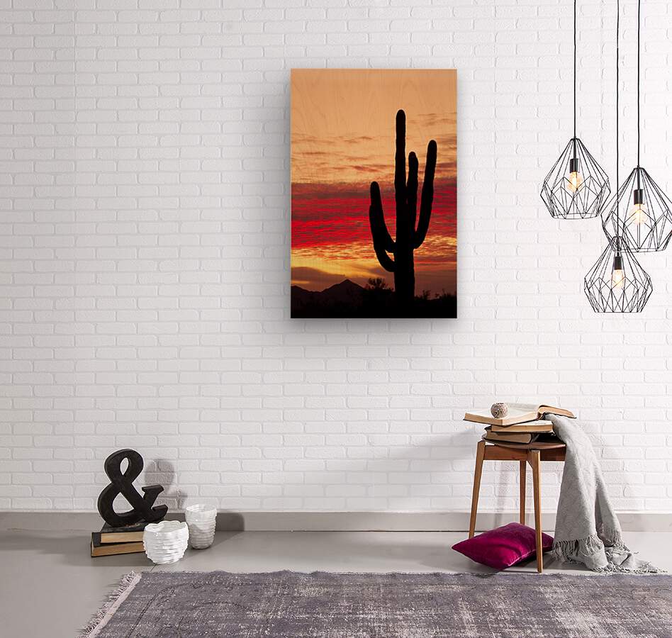 Sunrise in the Arizona Sonoran Desert with giant saguaro cactus and red burning sky. Fine art nature landscape photography prints canvas art and stoc...[+]