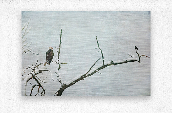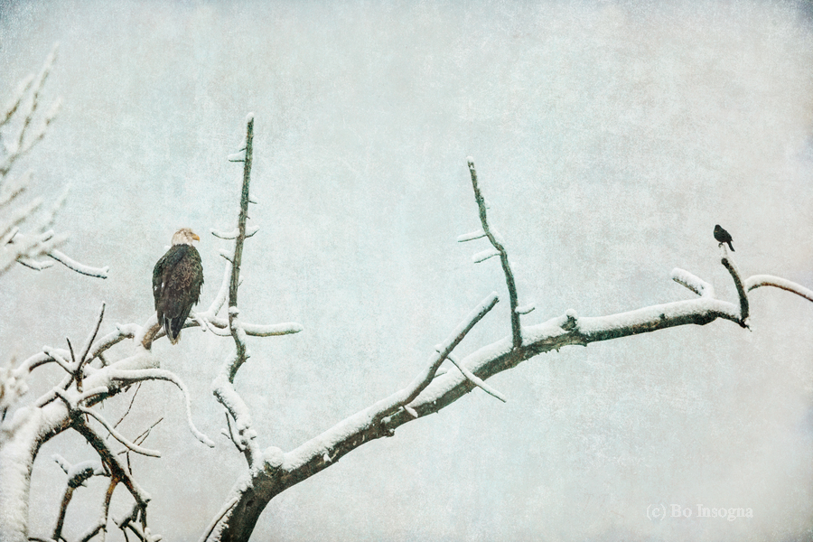Nice dusting of snowin the early morning as this beautiful bald eagle sits in a large cottonwood tree with a stare down of a little birdie.