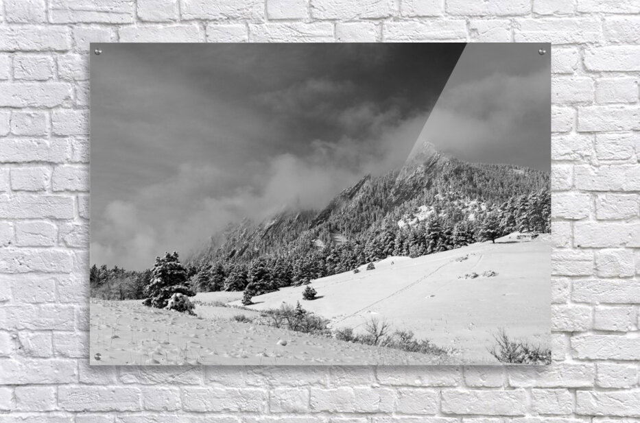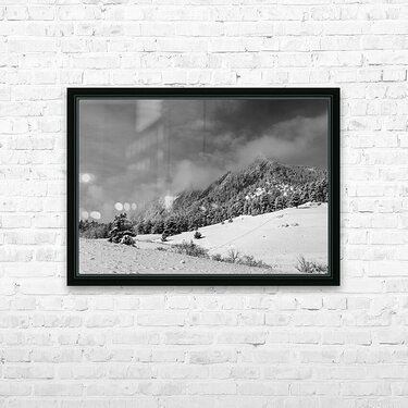 Get this artwork "Boulder Colorado Flatirons April Snow In Black and White" in a framed print.