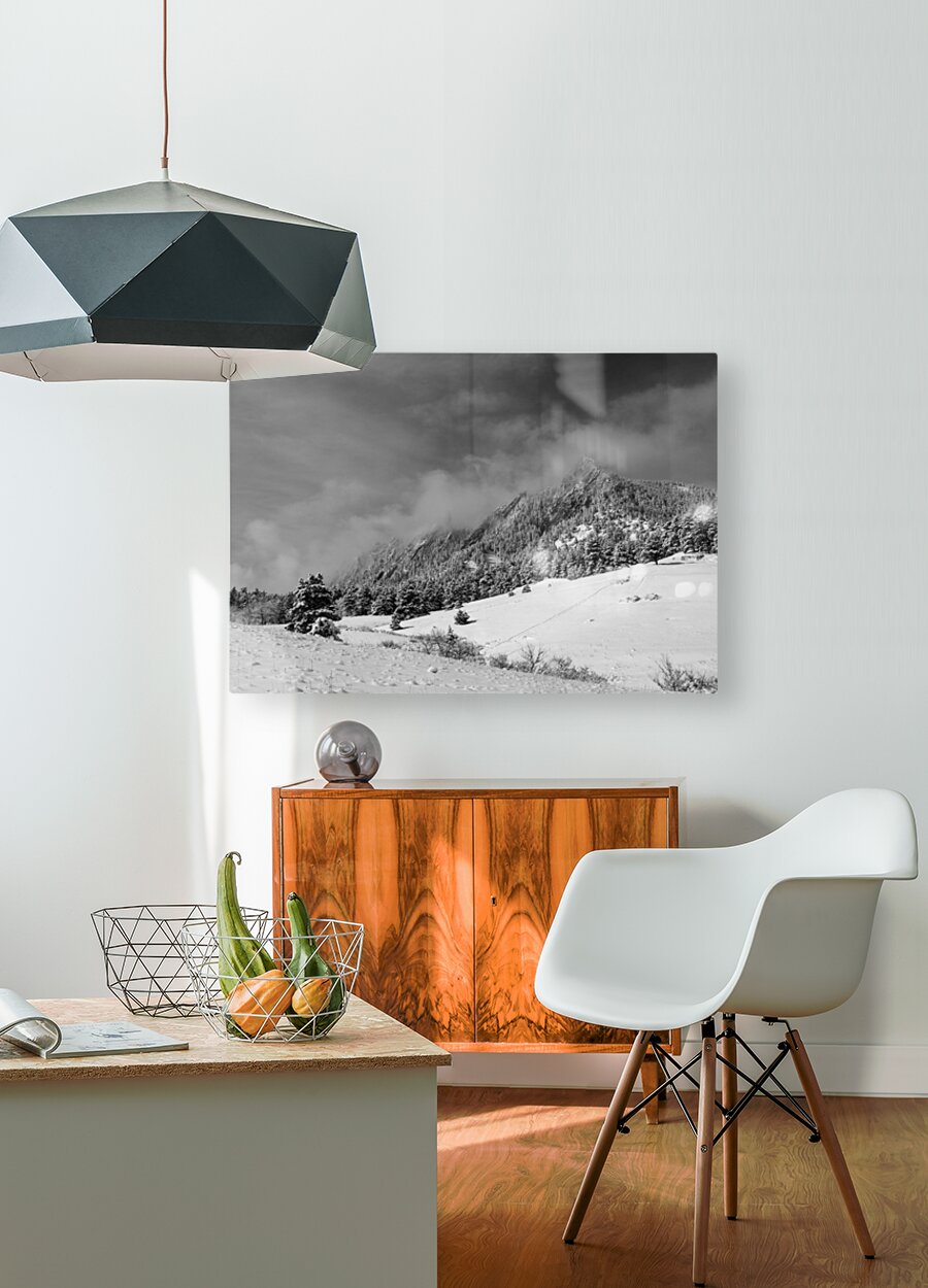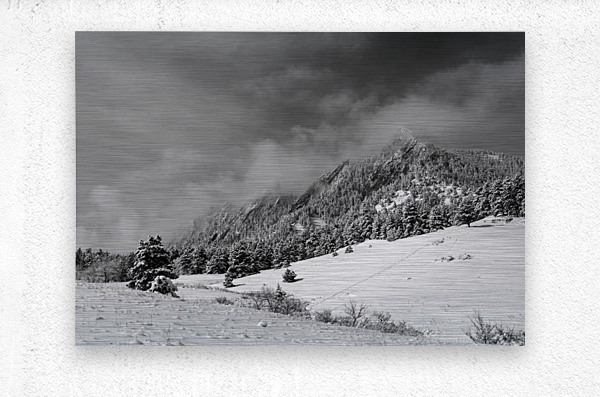 ABOUT THIS ARTWORK: BOULDER COLORADO FLATIRONS APRIL SNOW IN BLACK AND WHITE