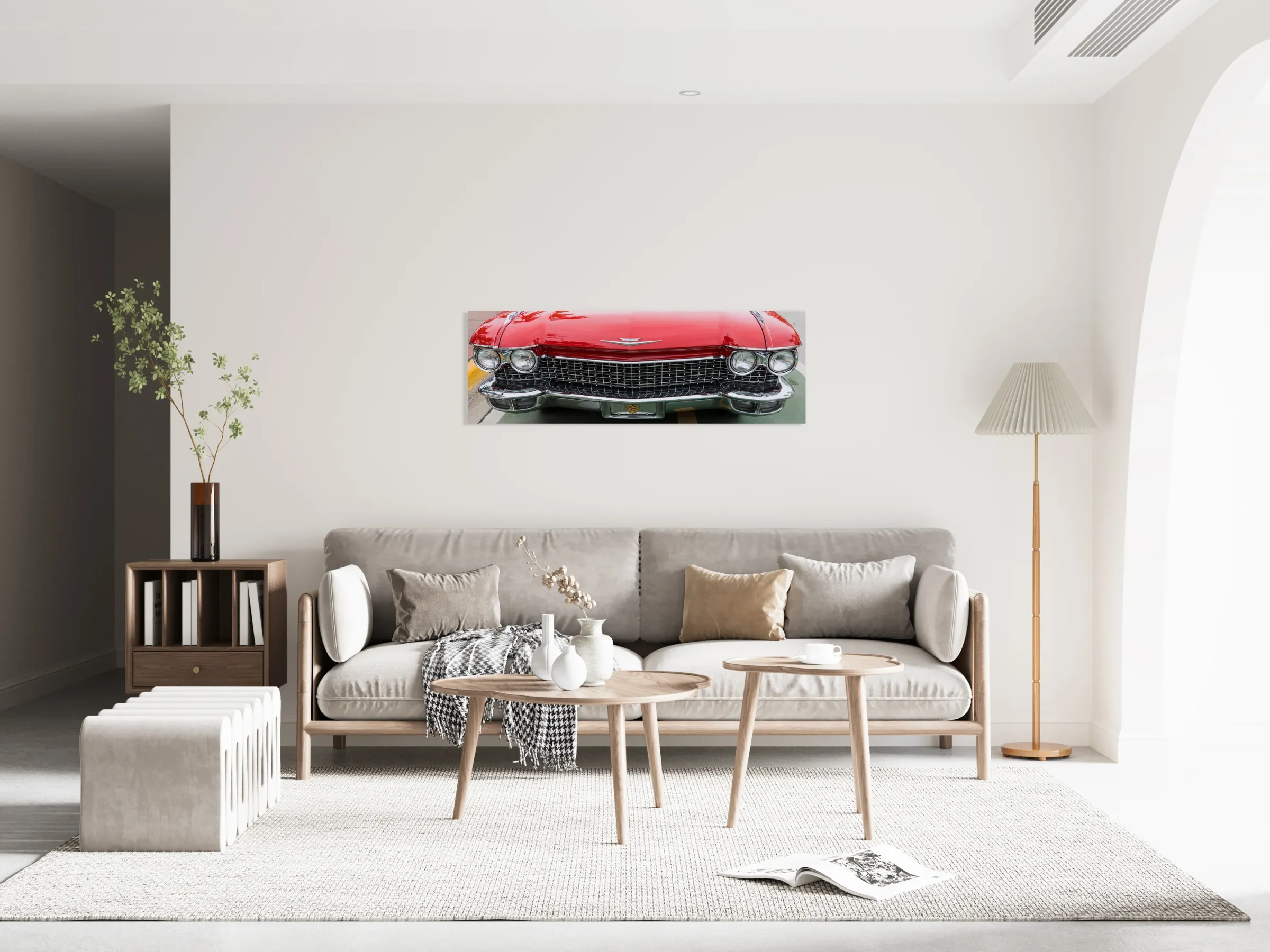 In this striking photograph the front end of a stunning red Cadillac Eldorado takes center stage showcasing the epitome of timeless automotive elegance. The sleek and polished exterior of the classic car gleams accentuating its iconic design. The panorama crop frames the image allowing for an immersive and detailed view of the Cadillacs distinctive features. The gracefully contoured lines of the Eldorados hood lead the eye to the iconic grille adorned with the Cadillac emblem a symbol of luxury and sophistication. The vibrant red hue of the car exudes a sense of boldness and flair capturing attention and making a statement against any backdrop. The panorama format not only accentuates the Eldorados aesthetic appeal but also highlights the meticulous craftsmanship and attention to detail that defines this automotive masterpiece. From the chrome accents to the sleek curves every element of the front end contributes to the overall allure of this vintage beauty. This close-up shot invites viewers to appreciate the timeless design and craftsmanship of the red Cadillac Eldorado offering a glimpse into an era of automotive excellence. Whether a car enthusiast or an admirer of classic style this photograph celebrates the enduring charm of a bygone automotive era.