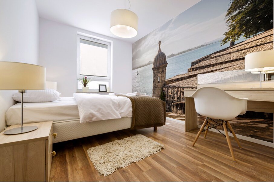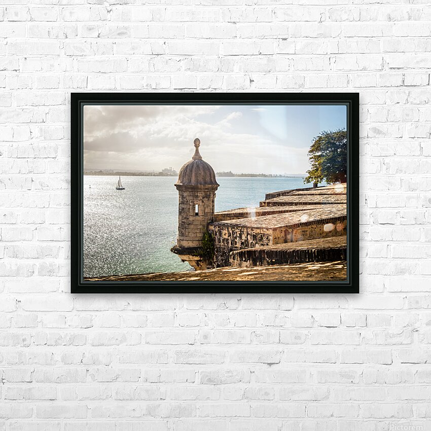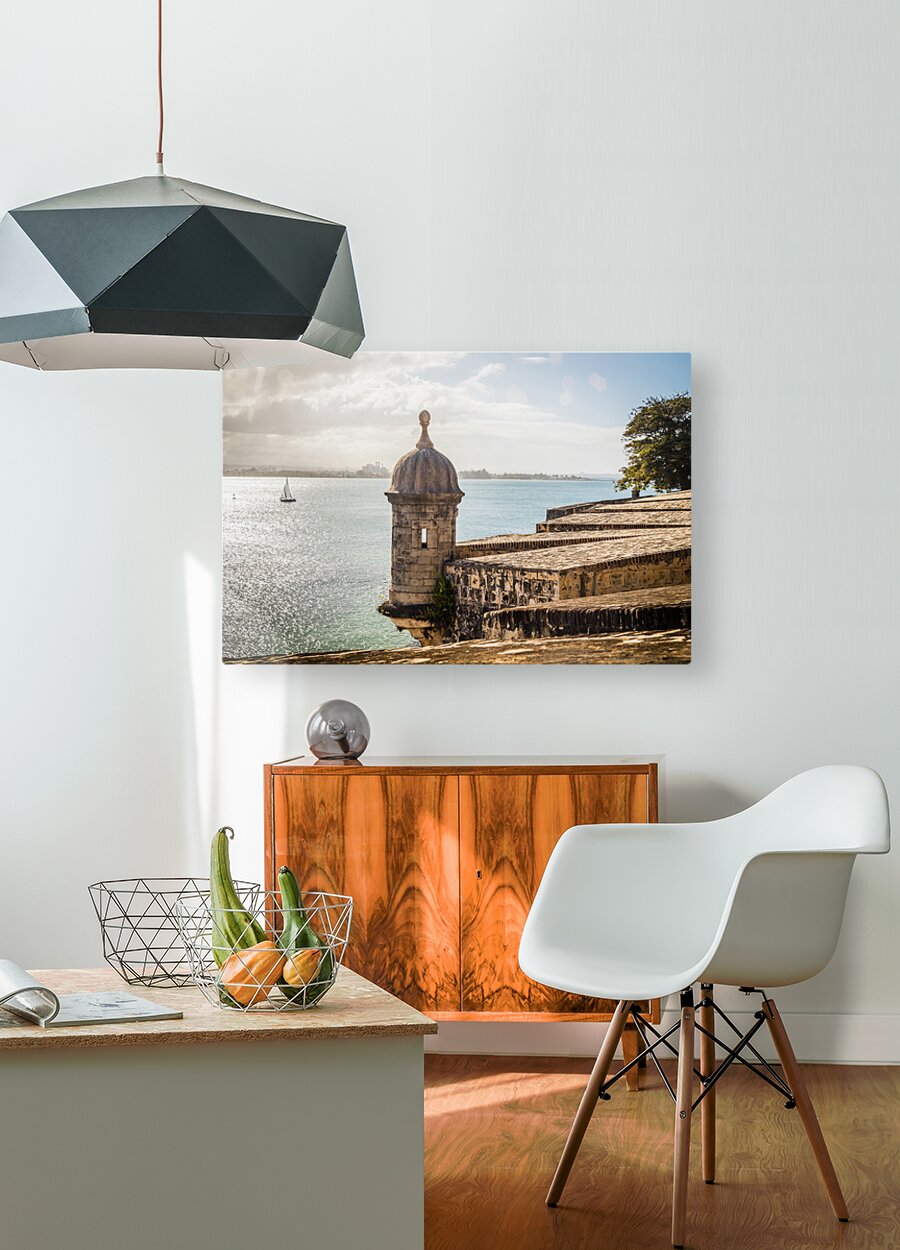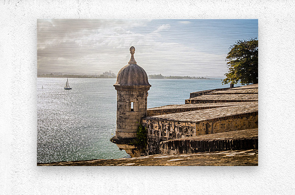 This captivating photograph captures a picturesque scene in San Juan Puerto Rico as the lens peers out over a textured stone wall. The weathered and textured surface adds a touch of historic charm setting the stage for the focal point of the image—the old guard tower overlooking the bay. Perched atop the citys fortifications the ancient tower stands as a timeless sentinel telling tales of centuries gone by. Beyond the textured wall and the imposing guard tower the expansive bay unfolds providing a stunning backdrop to the scene. The tranquil waters of the bay stretch out and against this maritime canvas a sailboat gracefully glides its silhouette adding a touch of serenity and movement to the panoramic view. The juxtaposition of the weathered wall texture the historical guard tower and the modern sailboat creates a visual narrative that encapsulates the rich layers of history and maritime life in San Juan. The photograph invites viewers to appreciate the harmonious blend of old-world charm and contemporary vitality in this captivating coastal city.