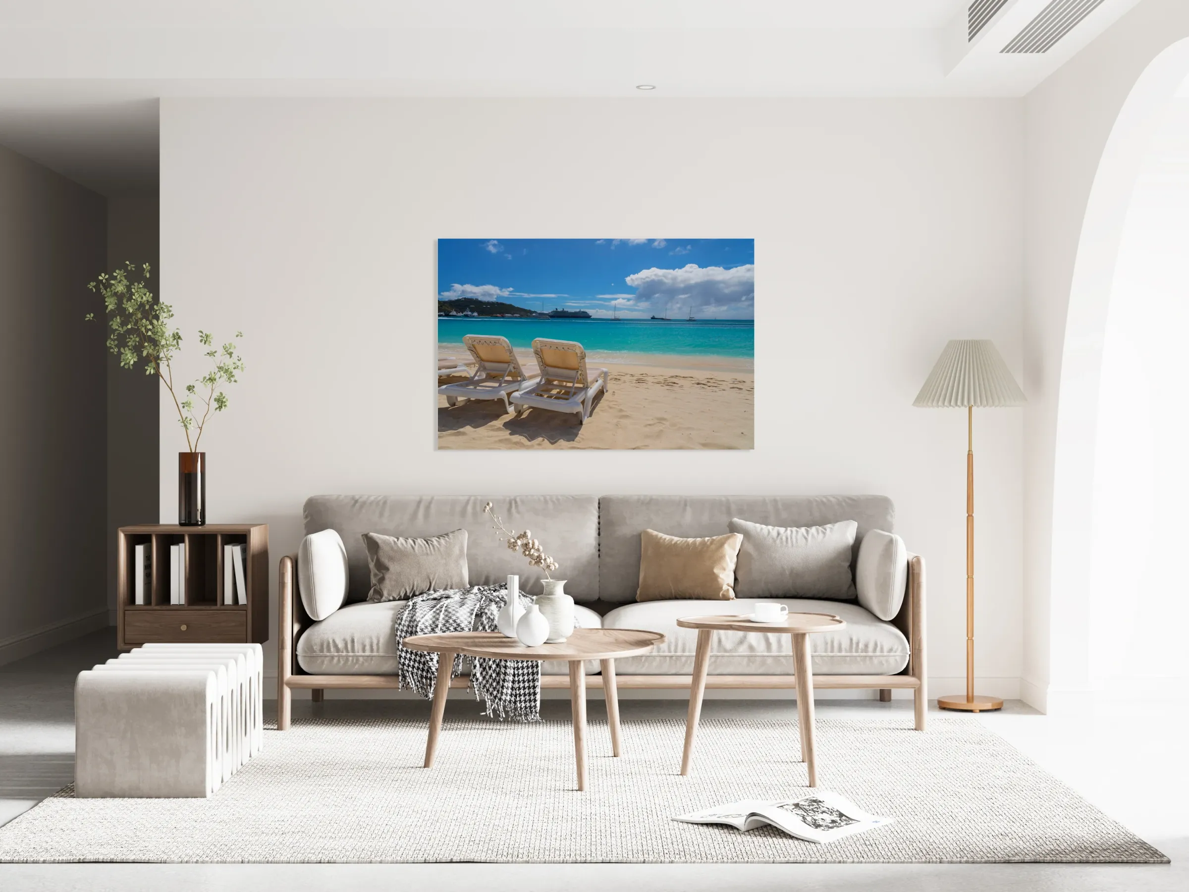 a pair of inviting lounge chairs are strategically placed on the pristine sandy beach overlooking the breathtaking expanse of the deep blue Caribbean ocean. Positioned to perfection these beachfront seats offer the perfect vantage point for relaxation and anticipation with a sense of serenity that complements the stunning natural beauty surrounding them. As the gentle waves of the Caribbean lap against the shore the scene sets the stage for a tranquil retreat. The azure waters extend to the horizon creating a mesmerizing backdrop that mirrors the vastness of the ocean. With a touch of anticipation the chairs seem to await the arrival of a majestic ship on the horizon enhancing the sense of adventure and exploration. This photograph encapsulates the essence of a serene beach getaway where the combination of comfortable lounging the beauty of the Caribbean and the anticipation of maritime adventures creates a perfect moment of coastal bliss. Its an invitation to unwind soak in the beauty of the surroundings and eagerly await the arrival of new and exciting horizons.