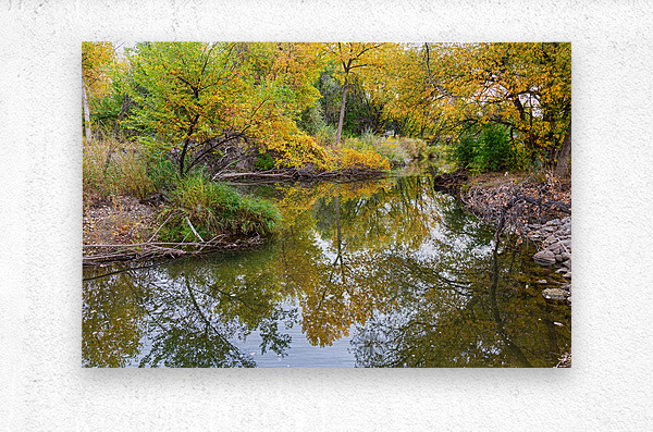 Reflections of autumn foliage trees in a very calm St Vrain River Longmont Colorado Boulder County. I hope this will take you to state of being t...[+]
