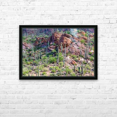 Scenic Sonoran desert landscape of a forest of saguaro cactus and large boulders showing off the beauty of Arizona. Fine art nature landscape photogra...[+]